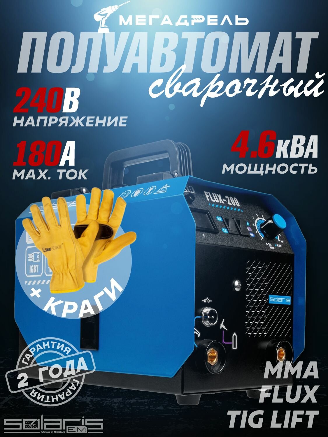 Полуавтомат сварочный без газа инверторный SOLARIS FLUX-200 + краги, полная мощность 4,6 кВА, напряжение холостого хода, В 80, макс. потребляемый ток, А 180, сварочник: сравнение цен, характеристики, фото, актуальное наличие и цены.