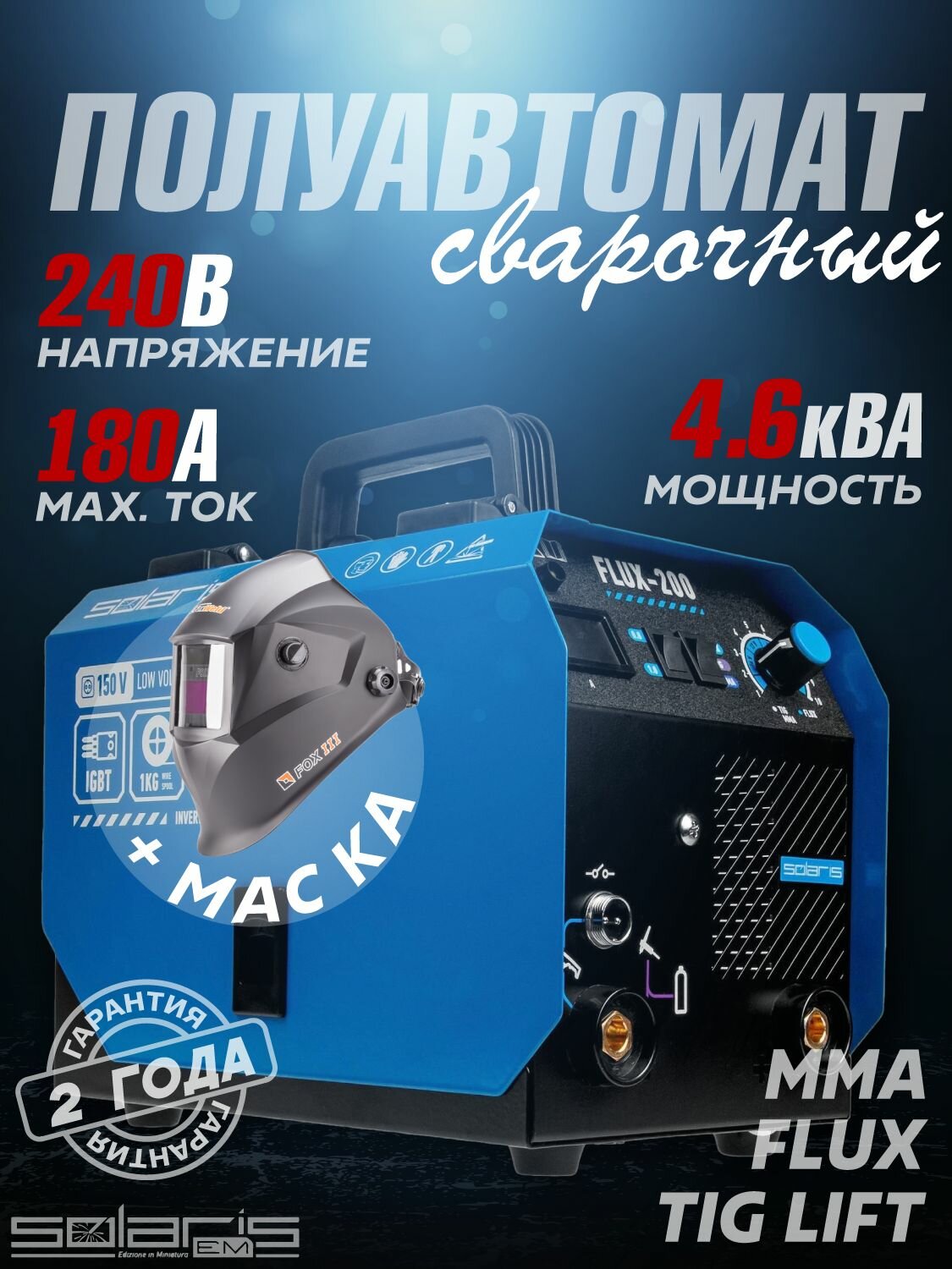Полуавтомат сварочный без газа инверторный SOLARIS FLUX-200 + маска в подарок, полная мощность 4,6 кВА, напряжение холостого хода, В 80, макс. потребляемый ток, А 180, сварочник: сравнение цен, характеристики, фото, актуальное наличие и цены.