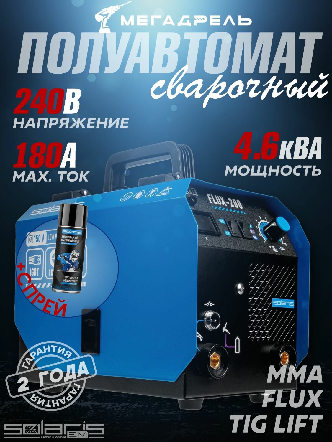 Полуавтомат сварочный без газа инверторный SOLARIS FLUX-200 + Спрей антипригарный, полная мощность 4,6 кВА, напряжение холостого хода, В 80, макс. потребляемый ток, А 180, сварочник: сравнение цен, характеристики, фото, актуальное наличие и цены.