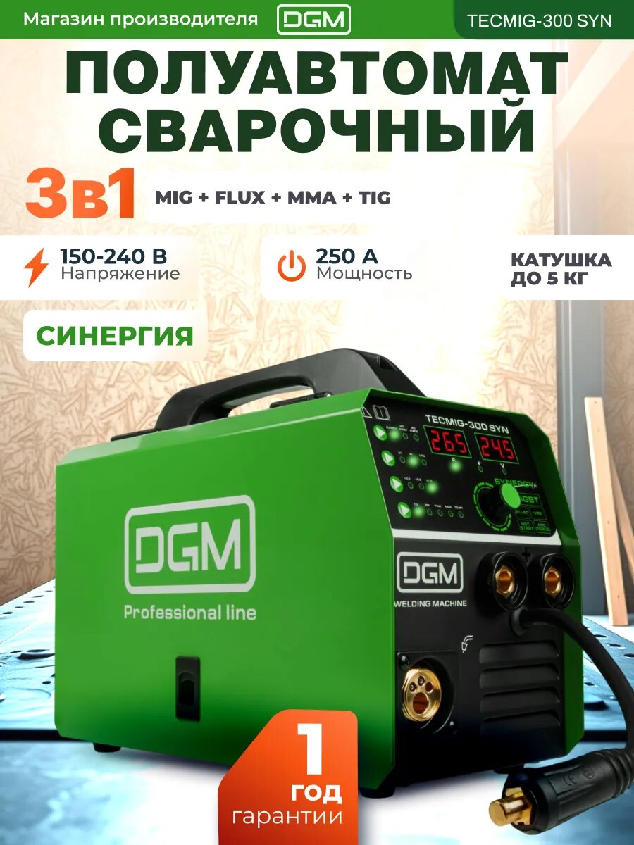 Полуавтомат сварочный DGM TECMIG-300 SYN, 220В; MIG/FLUX/MMA/TIG; Синергия; евроразъем; смена полярности (DG5822-9): сравнение цен, характеристики, фото, актуальное наличие и цены.