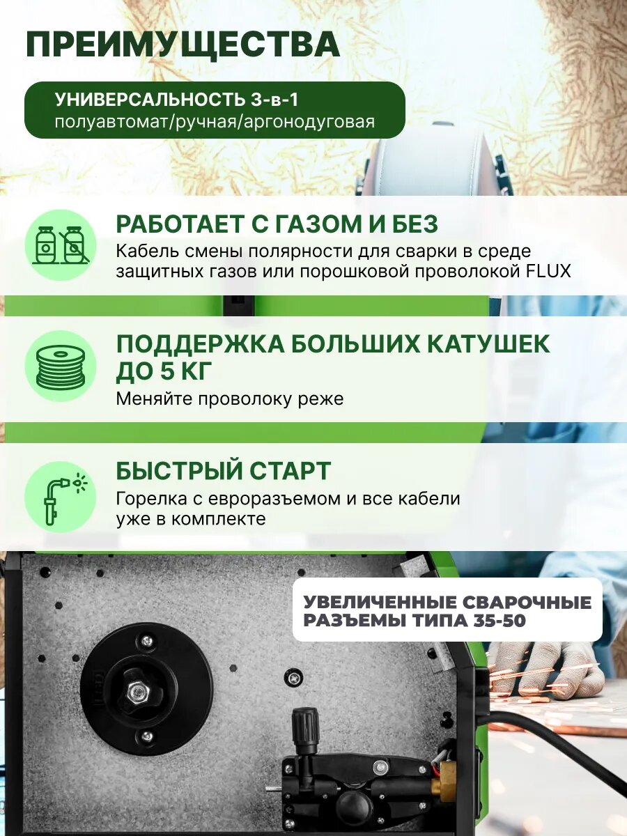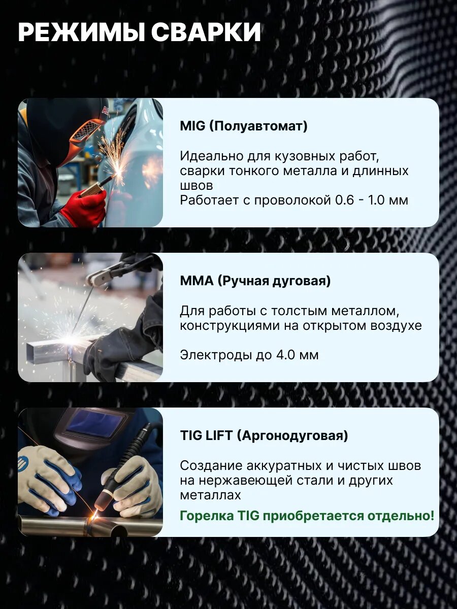 | Полуавтоматическая сварка (MIG/MAG) | есть |