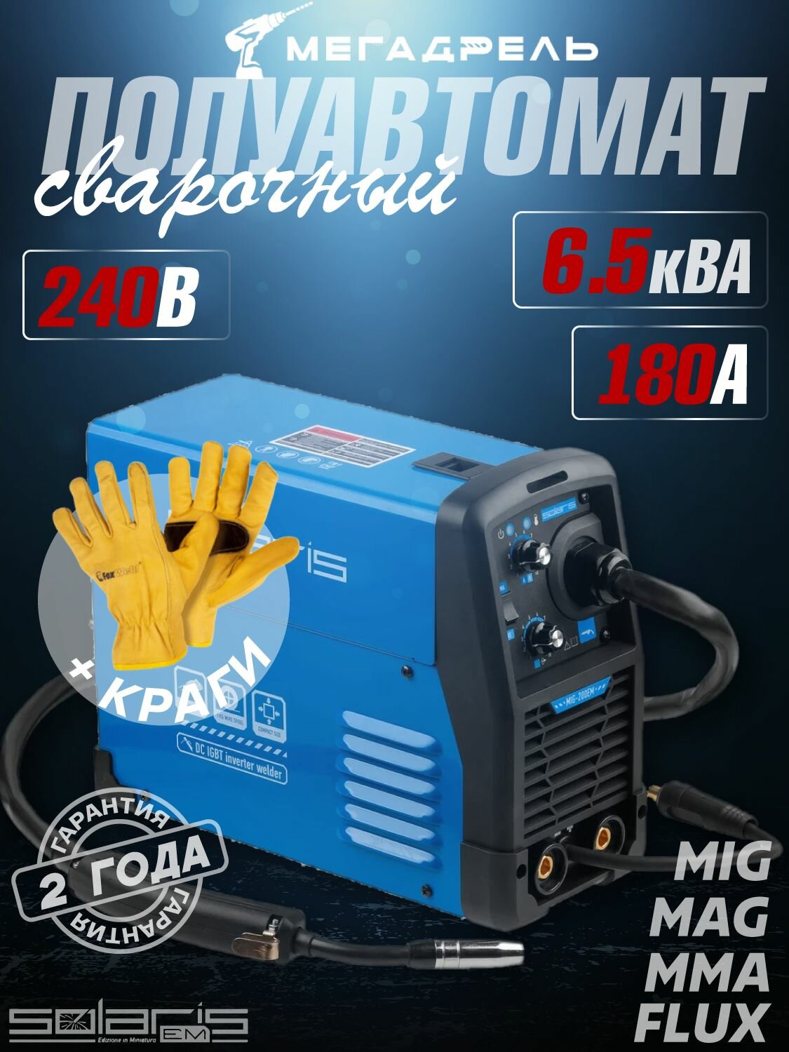 Полуавтомат сварочный инверторный SOLARIS MIG-200EM + краги, напряжение холостого хода, В 84, макс. ток, А 180, мощность 5.72 кВт, сварочник: сравнение цен, характеристики, фото, актуальное наличие и цены.
