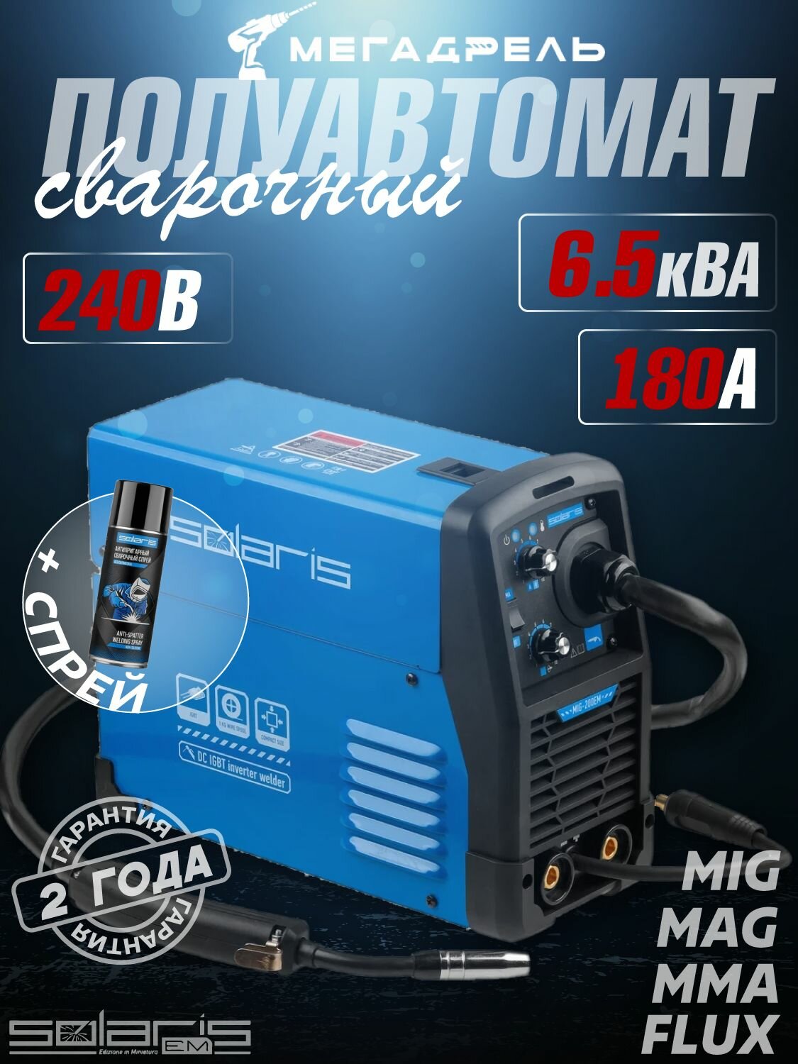 Полуавтомат сварочный инверторный SOLARIS MIG-200EM + Спрей антипригарный, с газом и без, напряжение холостого хода, В 84, макс. ток, А 180, мощность 5.72 кВт, сварочник: сравнение цен, характеристики, фото, актуальное наличие и цены.