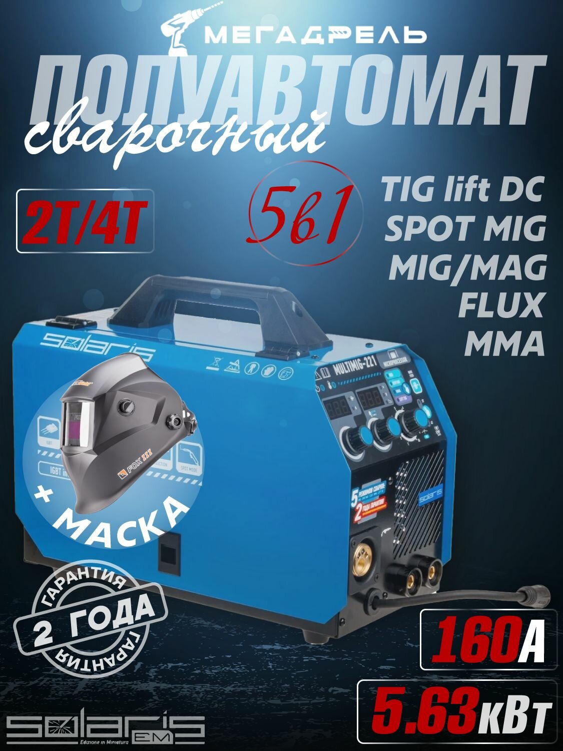 Полуавтомат сварочный инверторный SOLARIS MULTIMIG-221 с газом и без + маска в подарок, напряжение холостого хода, В 80, макс. ток, А 160, мощность 5.63 кВт, сварочник: сравнение цен, характеристики, фото, актуальное наличие и цены.