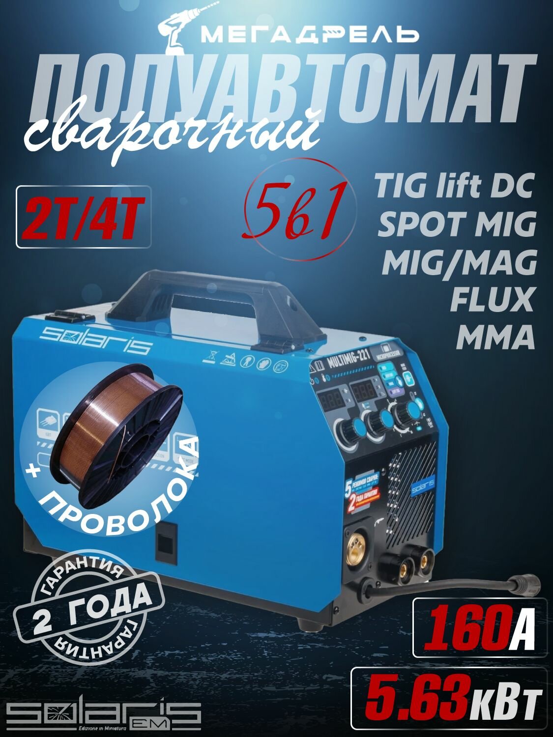 Полуавтомат сварочный инверторный SOLARIS MULTIMIG-221 с газом и без + проволока в подарок, напряжение холостого хода, В 80, макс. ток, А 160, мощность 5.63 кВт, сварочник: сравнение цен, характеристики, фото, актуальное наличие и цены.