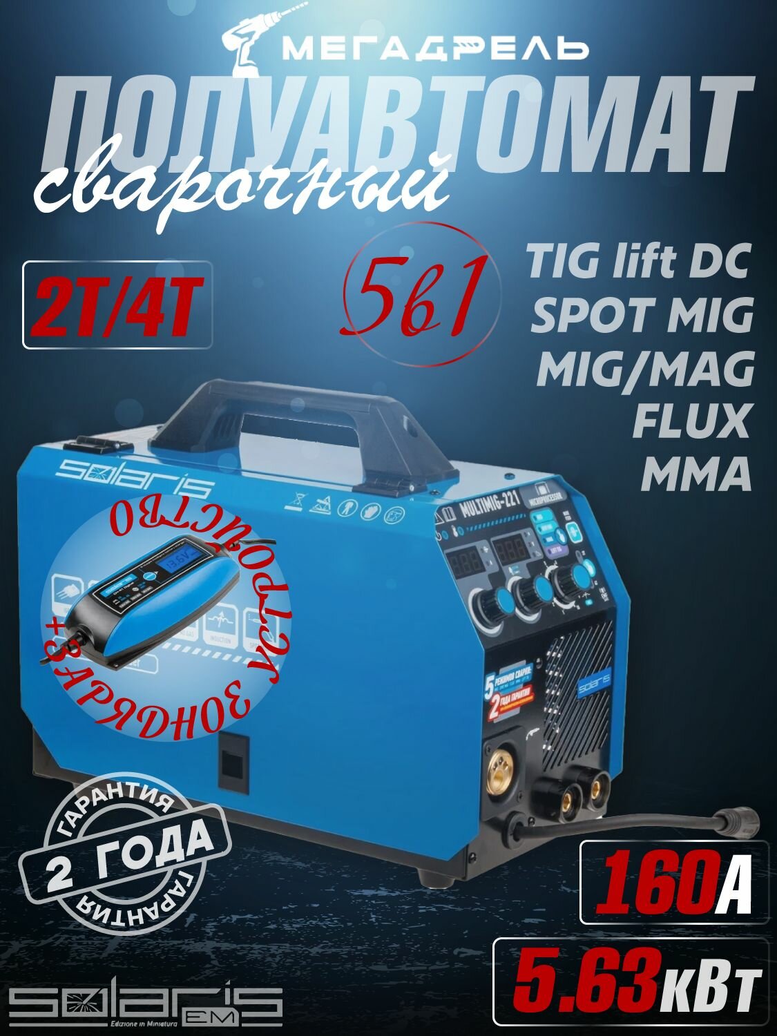 Полуавтомат сварочный инверторный SOLARIS MULTIMIG-221 с газом и без + Зарядное устройство SOLARIS CH-41 Digital в подарок, напряж. холостого хода, В 80, макс. ток, А 160, мощность 5.63 кВт, сварочник: сравнение цен, характеристики, фото, актуальное наличие и цены.