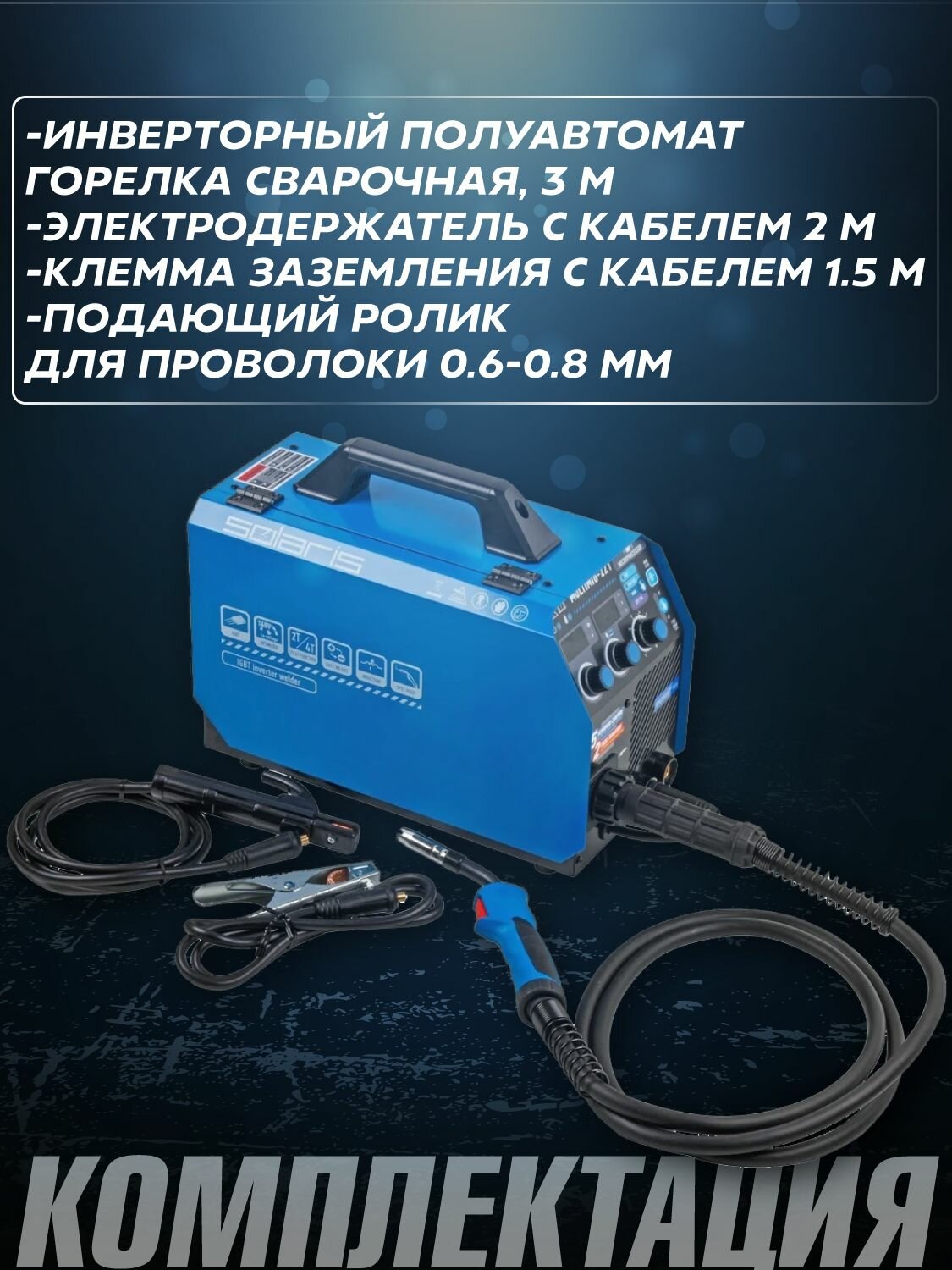 Купить Полуавтомат сварочный инверторный SOLARIS MULTIMIG-221 с газом и без + Зарядное устройство SOLARIS CH-41 Digital в подарок, напряж. холостого хода, В 80, макс. ток, А 160, мощность 5.63 кВт, сварочник с доставкой по всей России.