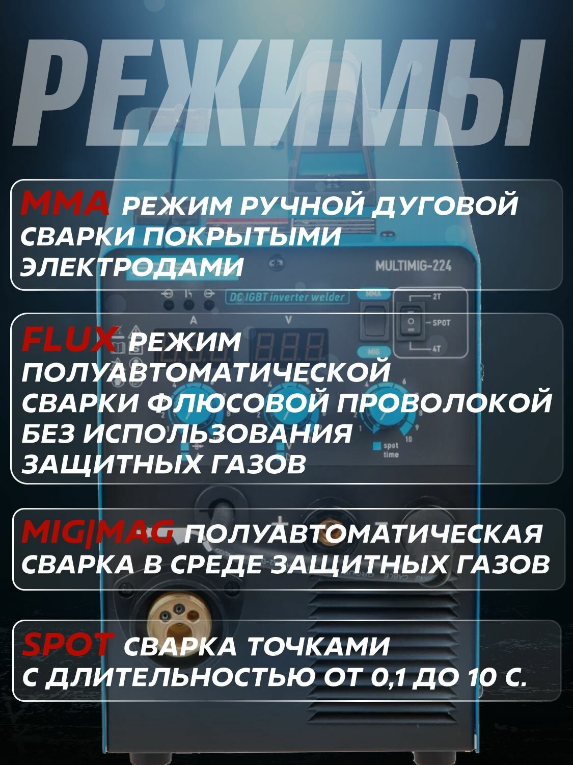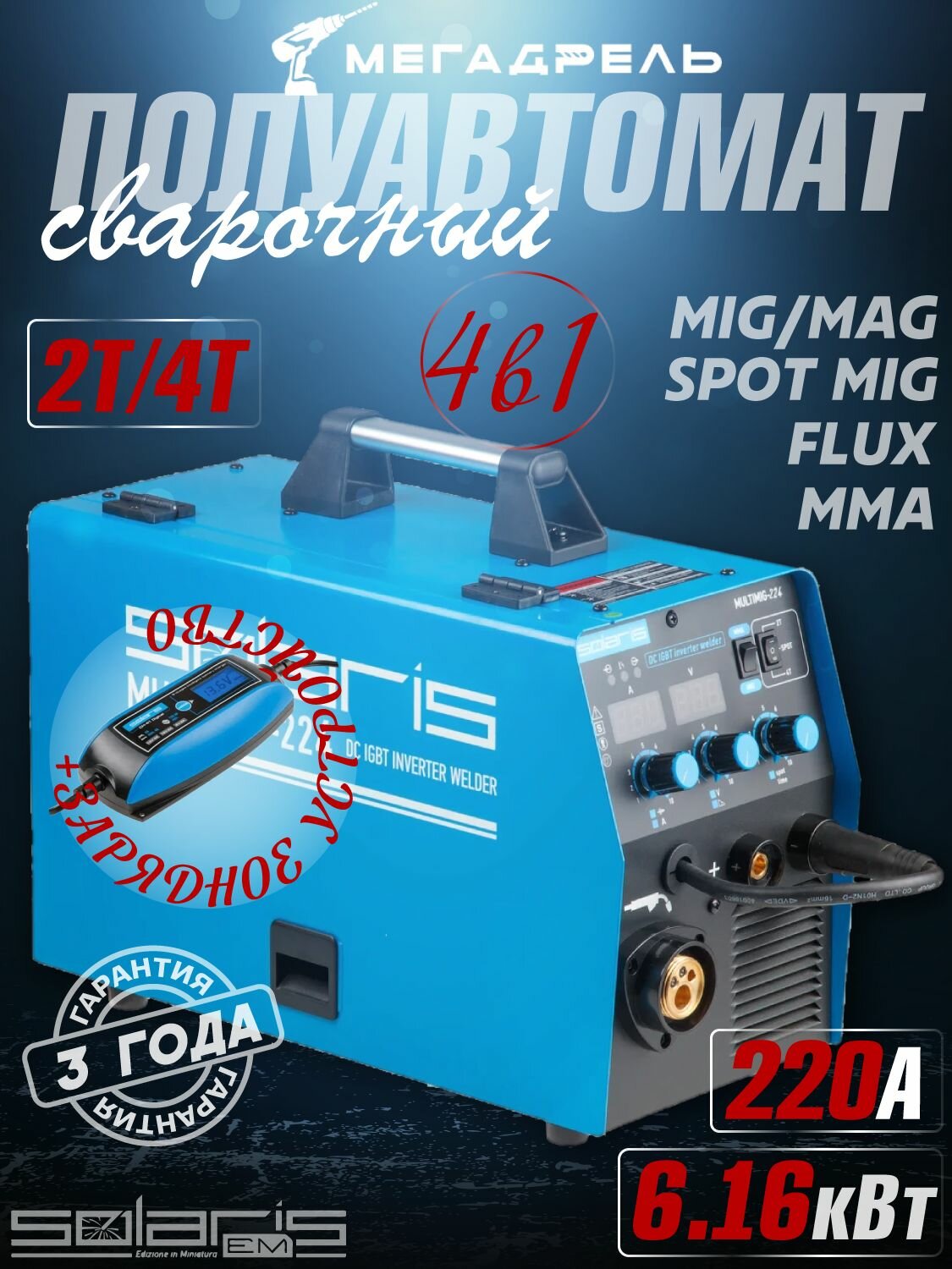 Купить Полуавтомат сварочный инверторный SOLARIS MULTIMIG-224 с газом и без + зарядное устройство SOLARIS CH-41 Digital в подарок, напряж. холостого хода, В 67, макс. ток, А 200, мощность 6.16 кВт, сварочник с доставкой по всей России.