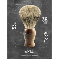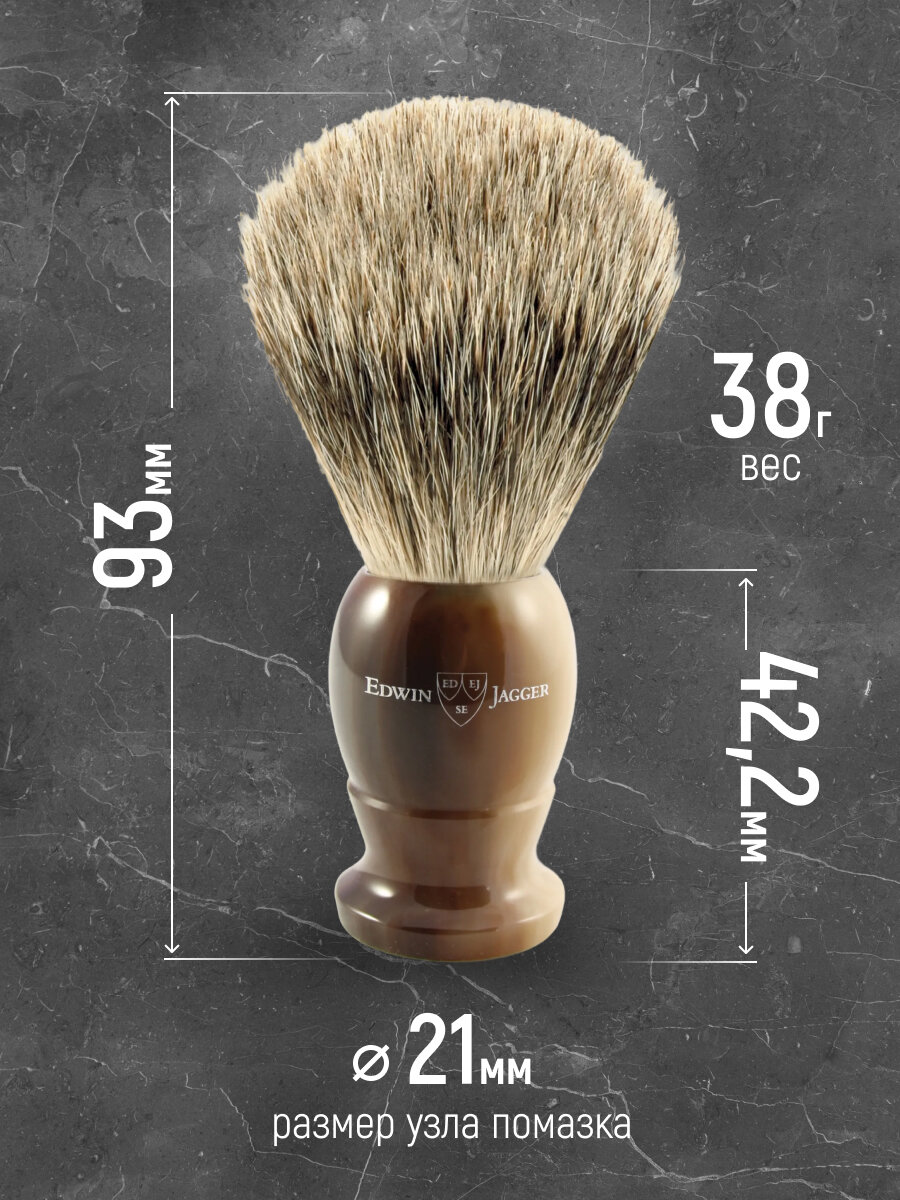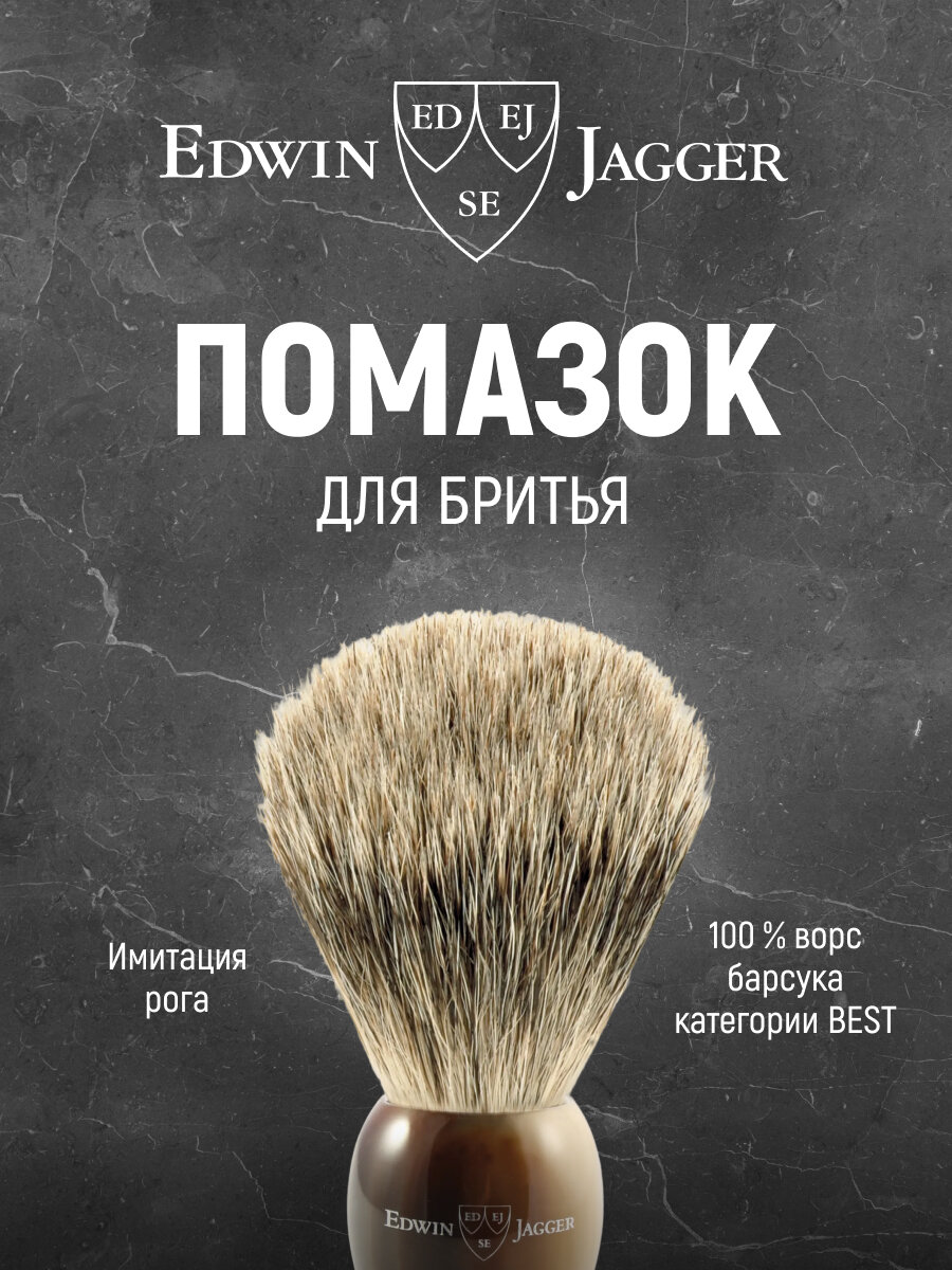 Помазок для бритья 9EJ872 (щетка барсучий ворс) известной британской компании с мировым именем по производству косметических продуктов, аксессуаров и прочих различных бритвенных принадлежностей Edwin Jagger, создан на основе последних современных фирменных разработок и, как и другие товары марки, обладает высоким качеством, максимальным эффектом от применения, надёжностью и долговечностью. Изделие представляет собой эргономичную, стильную и элегантную щётку классического английского дизайна с натуральным барсучьим ворсом типа Best Badger — более благородным, мягким и тёмным вариантом моделей Pure Badger, которые деликатней влияют на кожу лица. Ручка создана из акриловой смолы с имитацией формы рога буйвола и будет надёжно держаться в руке. При условии применения качественного мыла или крема для бритья, помазок создаёт густую и пышную пену, которая легко наносится на кожу лица, облегчая бритьё. Вес изделия 38 грамм.