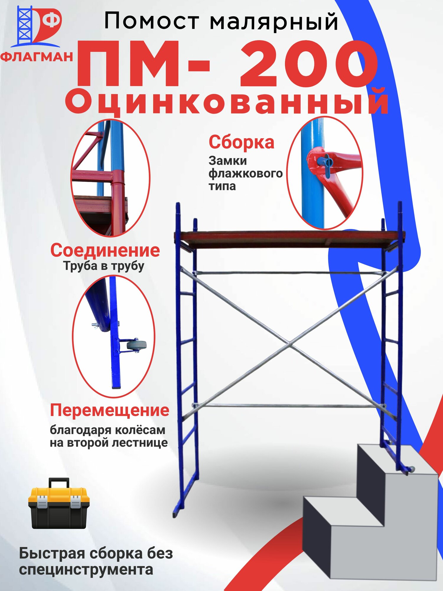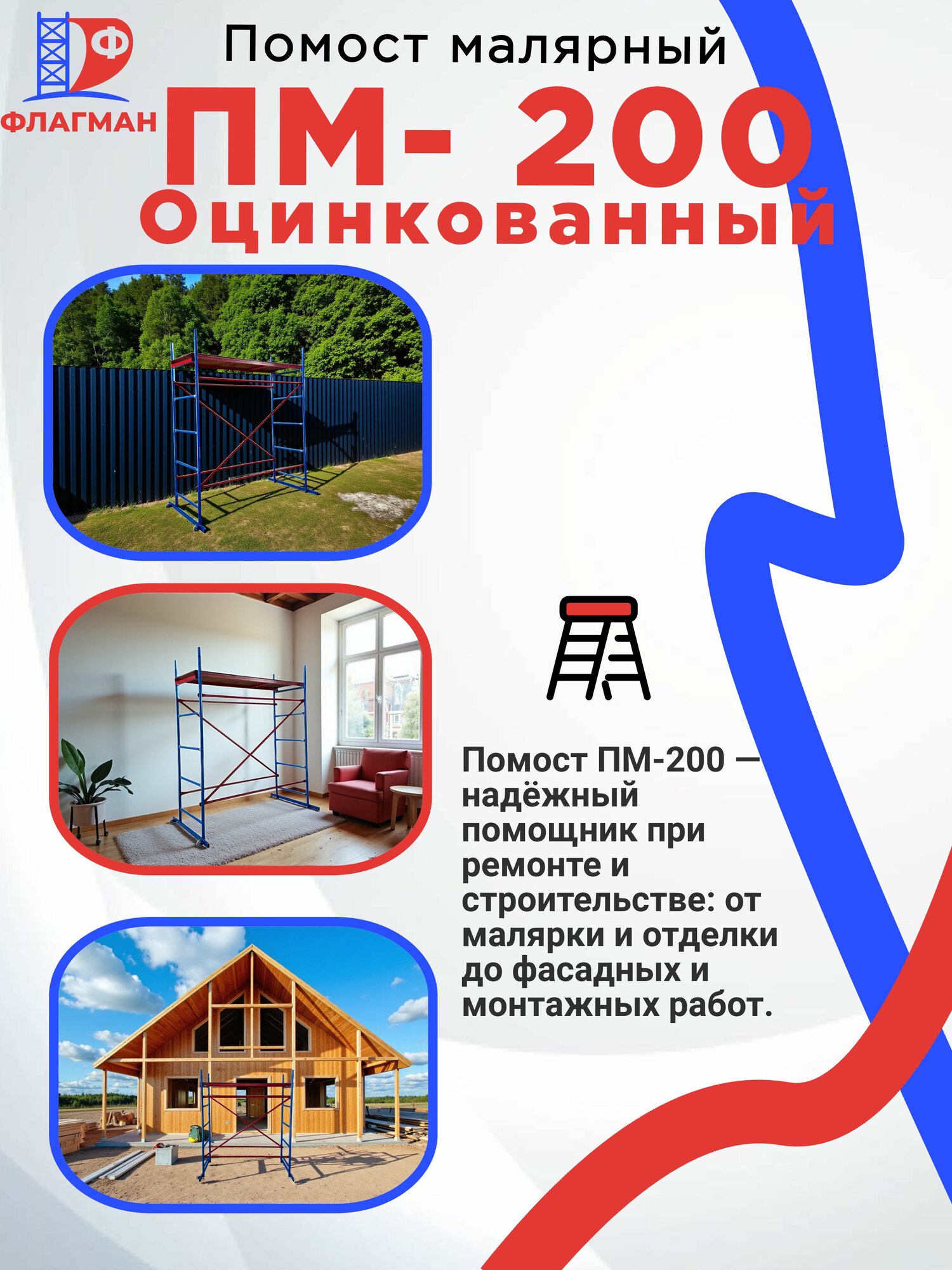Помост строительный малярный ПМ-200 оцинкованный — надёжная, лёгкая и долговечная рабочая платформа для отделочных, малярных и монтажных работ. Оцинкованные стяжки защищают конструкцию от коррозии и обеспечивают длительный срок службы, что позволяет использовать помост как в помещении, так и на улице.