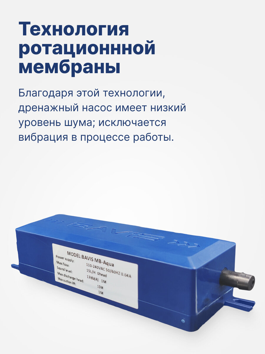 BAVIS MB-AQUA — помпа проточного типа производительностью 15 л/ч для отвода конденсата от бытовых и полупромышленных систем кондиционирования. Устанавливается в корпусе внутреннего блока, над потолком, в кабель-канале или в дренажной магистрали. Помпа состоит из насосного блока (качающий узел) и резервуара с поплавковым датчиком уровня воды. Качающий узел насоса MB-AQUA изготовлен по технологии ротационной мембраны . Благодаря этой технологии, дренажный насос имеет сверхнизкий уровень шума 17Дб, а также исключается вибрация в процессе работы. Особенности: Компактный корпус из ABS-пластика совместим с большинством из существующих сплит-систем; Электронная система управления выполнена по схеме раздельных контуров и имеет несколько степеней защиты от скачков напряжения в электросети; Все узлы и элементы конструкции выполнены с учетом эксплуатации в условиях повышенной механической нагрузки; Специально разработанная резиновая смесь для условий интенсивных нагрузок и низких температур; Гальваническое антикоррозионное покрытие гарантирует защиту деталей в условиях повышенной влажности; Качающий узел насоса изготовлен по технологии ротационной мембраны, благодаря чему дренажный насос имеет сверхнизкий уровень шума. Технические характеристики: Макс. производительность: 15 л/ч (при 0 напоре); Макс. высота подъема: 15 м; Высота всасывания: до 1 м; Уровень шума: 17 дБ (на расстоянии 1м); Электропитание: ~100-240В перем. тока, 50–60 Гц; Емкость резервуара: 40 мл; Макс. потребляемая мощность: 3 Вт; Макс. температура воды: 70°C; Аварийная схема: NC-COM, 3А/~240В Степень защиты: IP66; Габариты ДхШхВ: 106мм х 35,7мм х 28мм. Комплектация: Впускная трубка, диаметр 16 мм: 1 шт; Антисифонный клапан: 1 шт; Резервуар датчика уровня: 1 шт; Соединительная трубка 6х9 мм: 1 шт; Насосный модуль с кабелем питания: 1 шт; Хомут-стяжка 200 мм: 4 шт; Самоклеящаяся подложка: 2 шт; Саморез 3,5х12 мм: 4 шт. Инструкция по установке и эксплуатации на русском языке.