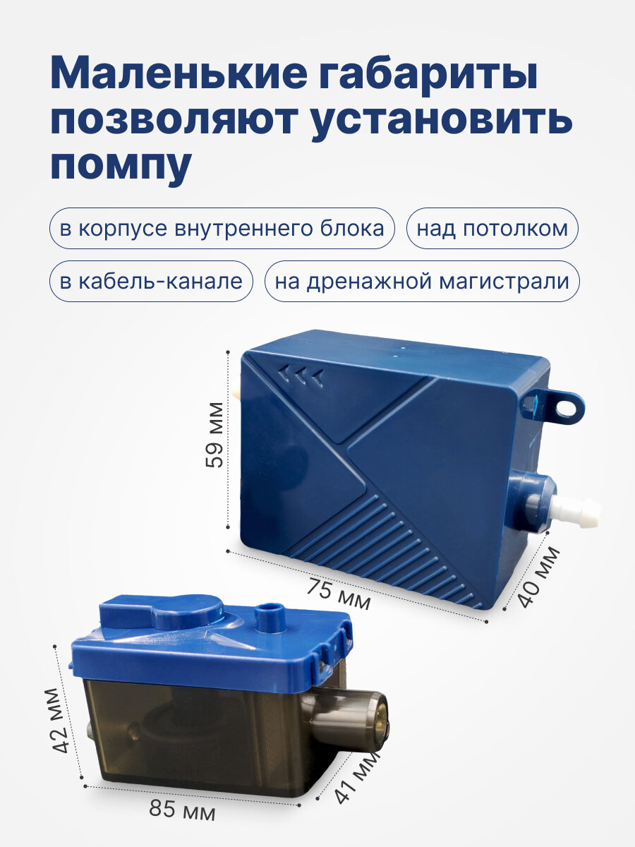 Помпа дренажная BAVIS MS-20 Mini - проточная дренажная помпа, максимальной производительностью 20 л/ч. Предназначена для использования с оборудованием кондиционирования мощностью по холоду до 20 кВт. Уровень шума 17 дБ. Благодаря своей конструкции помпа легко устанавливается в корпусе внутреннего блока, над потолком, в кабель-канале или на дренажной магистрали, обеспечивая эффективное удаление конденсата. Технические характеристики: Электропитание: ~100-240В 50/60Гц; Потребляемая мощность: 5 Вт; Производительность (макс.): 20 л/ч; Высота подъема (макс.): 15 м; Уровень шума (расст. 1м): 17 дБ; Габариты датчика: 85 х 42 х 41 мм; Габариты насосного модуля: 75 х 59 х 40 мм; Диаметр впускного фитинга: 6 мм; Диаметр выпускного фитинга: 6 мм; Степень пылевлагозащиты: IP66; Температура воды (макс.): 70 гр. С; Аварийная схема: NC-COM, 3A/~240В резистивной нагрузки. Особенности: Низкое энергопотребление. Уровень шума ниже по сравнению с поршневыми помпами. Герметичные резьбовые разъемы коммутационных проводов. Отводимый насосом конденсат не участвует в охлаждении насоса (не требуется термозащита насосного модуля). Поплавковый датчик уровня реализованный на эффекте Холла. (отсутствует электромеханическая коммутация). Кратковременная сервисная прокрутка насосного модуля по таймеру раз в 7 дней (исключает залипание клапанов насоса в период простоя). Комплект поставки: Насосный модуль - 1 шт. Датчик уровня с управляющим кабелем - 1 шт. Крепежная площадка датчика - 1 шт. Приемная трубка 14.5 х 20.5 х 150 мм - 1 шт. Соединительная трубка 6 х 9 х 1500 мм - 1 шт. Кабель питания и аварийной схемы - 1 шт. Самоклеящаяся подложка - 2 шт. Хомуты-стяжки - 6 шт. Саморезы - 4 шт.