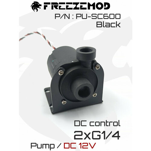 Помпа PU-SC600 от FREEZEMOD — доступная альтернатива моделям D5 и DDC. Она отличается высоким качеством и напоминает конструкцию помп EHEIM. Помпа выпускается под напряжение 12 В и 24 В и с разными видами кронштейнов. Эта версия рассчитана на 12 В и оснащена 3-контактным коннектором для подключения к разъёму fan на материнской плате. В комплект входит кронштейн (Upward outlet), который позволяет установить помпу патрубком вверх.