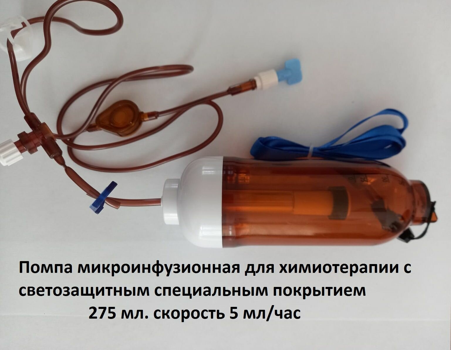 Помпа предназначена для введения лекарственных препаратов с фиксированной скоростью в течение продолжительного времени. Светозащищенный корпус и магистраль.