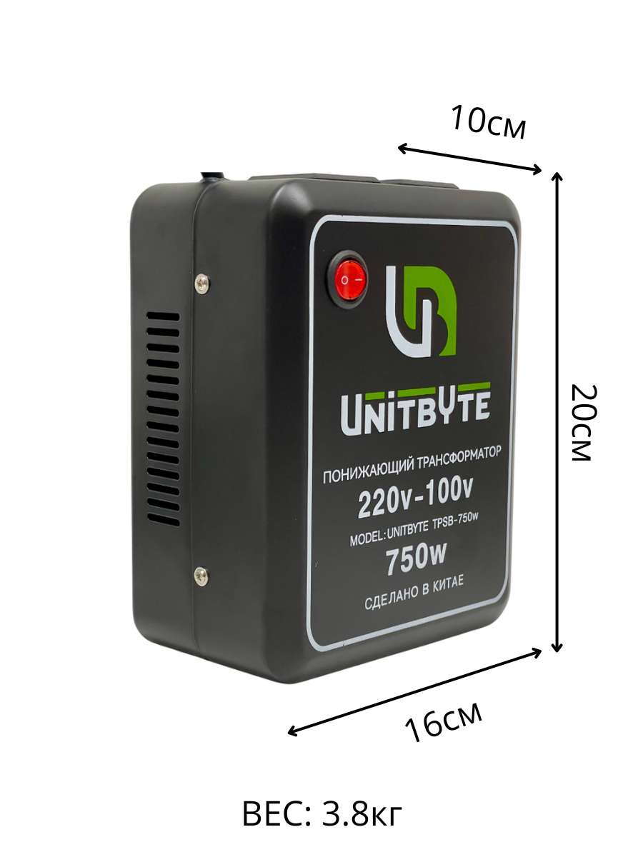 Универсальный автотрансформатор на 100в и 110в. В данной модели есть две розетки. Одна для японской техники на 100в, и другая для американской техники на 110в. Понижающий трансформатор (адаптер, преобразователь) UNITBYTE TP750W Понижающие трансформаторы (преобразователи) торговой марки UNITBYTE серии TP предназначены для адаптации бытовой техники и электроники с входящим напряжением 100-120в, сделанных для японско-американской электрической сети, к работе в нашей электрической сети 220-240в Понижающий трансформатор 220v-100v/750W Трансформатор понижает напряжение в сети 220в до 100в(110d), что делает возможным использования приборов с номинальным напряжением 100-120 в. из США, Канады, Японии, и др. в России. Очень важно! При расчете необходимой мощности надо учитывать, что мощность трансформатора указана пиковая , при том , что мощность приборов так же указана пиковая. Это значит, что для комфортной работы подключаемого прибора мощность трансформатора должна быть больше мощности прибора. Чем больше будет запас, тем меньше будет нагреваться трансформатор. Практика показывает что для комфортной работы прибора, запас мощности должен быть от 30%. Говоря простым языком потребителя: Например: к трансформатору 750вт можно подключать полезную нагрузку не более 520вт максимальной мощности. Температура окружающей среды: -10 градусов- + 40 градусов, относительная влажность : 10%-85%. Входное напряжение: 220 V входная частота: 50/60 Гц Выходное напряжение : 100V(110V) выходная частота: 60/50 Гц Упаковка 4,050кг / Размер 29/21/16см Без упаковки 3,800кг / Размер 20/16/10см Понижающий трансформатор 220в-100в 750вт; Понижающий трансформатор 220в-110в 500вт; Понижающий трансформатор 220v-100v 750w; Понижающий трансформатор 220v-110v 750w; Понижающий трансформатор 220в-100в; Понижающий трансформатор 220в-110в; Понижающий трансформатор 220-100; Понижающий трансформатор 220v-120v; преобразователь 220-110; адаптер 220-100 750вт;