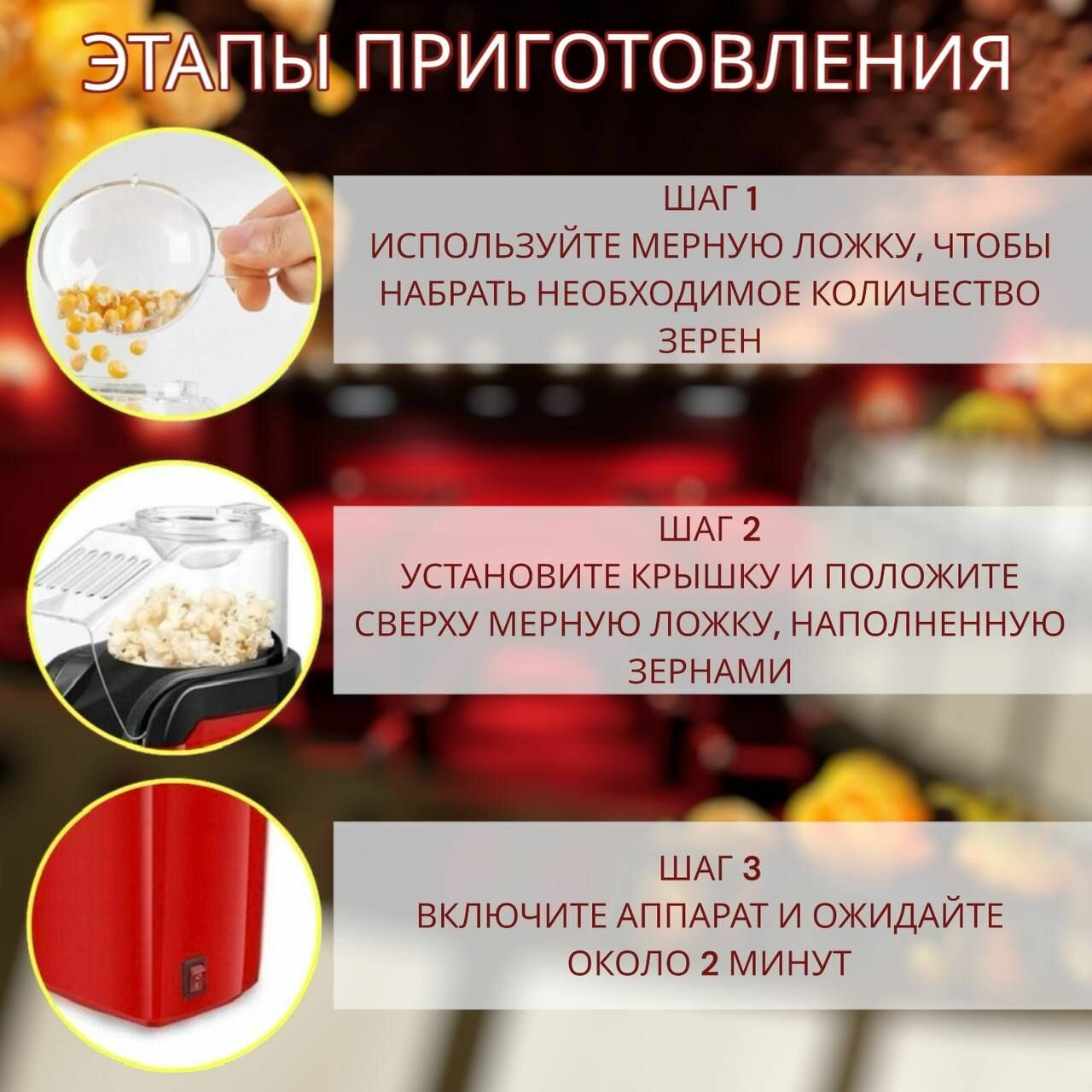 Имея такое простое в использовании устройство, вы сможете угостить гостей в любое время. Этот попкорн мейкер также будет отличным подарком на день рождения или любой другой праздник. Он подарит возможность насладиться вкусом свежего попкорна в комфортных условиях дома. Попкорн всегда актуален, особенно во время просмотра нового фильма или сериала. Попкорница - это удобный и простой в использовании аппарат для приготовления вкусного попкорна прямо у вас дома. Благодаря этому устройству, вы можете наслаждаться свежим и ароматным попкорном в любое время. Более того, попкорница не требует использования масла, что делает приготовление попкорна еще более полезным и нежирным. С помощью попкорницы вы сможете создать атмосферу вечера с друзьями или семейного киносеанса. Этот маленький и компактный аппарат идеален для домашних вечеров, когда вы хотите устроить незабываемый отдых в уютной обстановке.