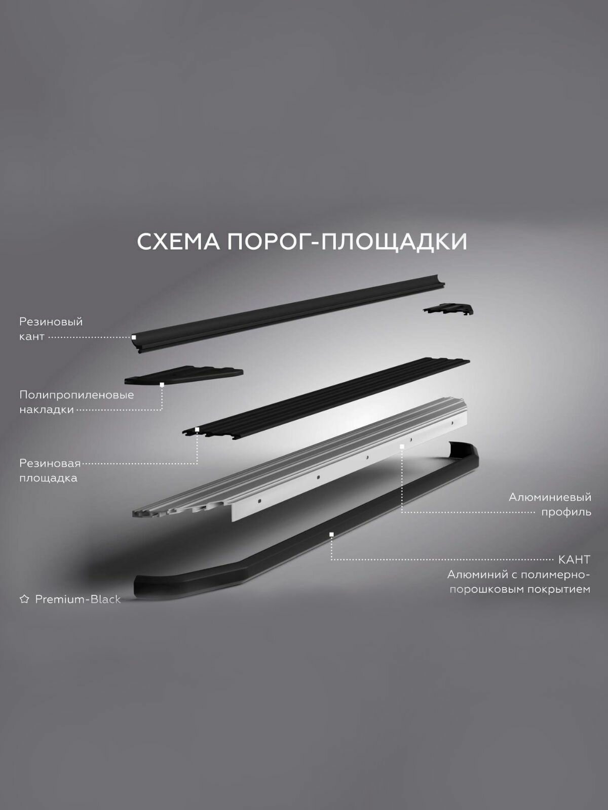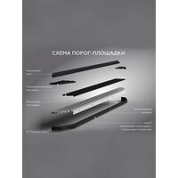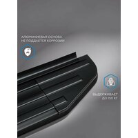 Подножки Premium Black- выполнены из алюминиевого профиля, антискользящее прорезиненное покрытие, впрессованное в профиль, которое не твердеет на морозе, впереди черный алюминиевый кант, покрытый долговечной порошковой краской и сзади предусмотрен резиновый уплотнитель, препятствующий попаданию грязи, летящий из под днища автомобиля.