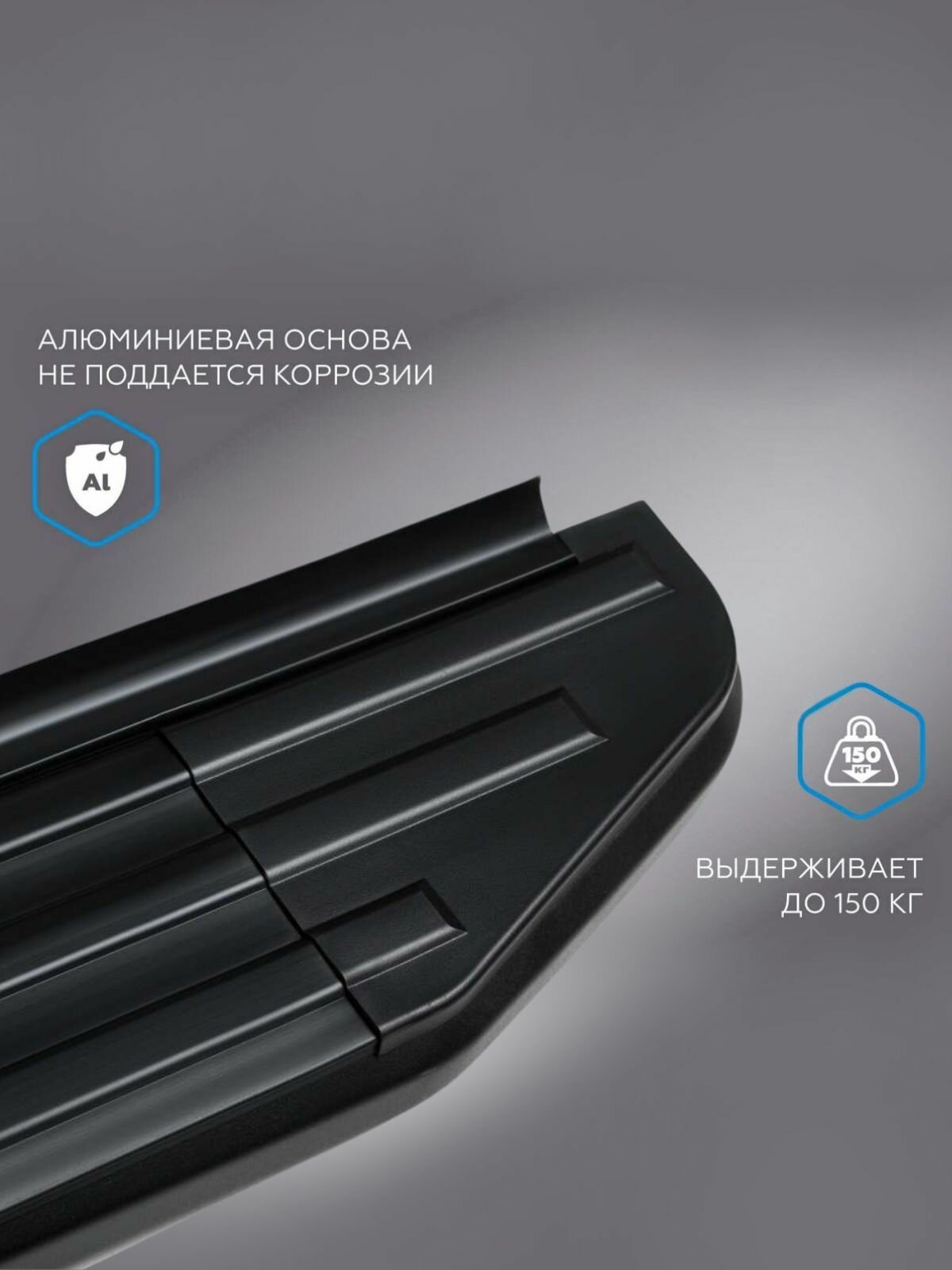 Пороги для автомобиля изготавливаются из алюминиевого профиля (сплав алюминия и магния), способны выдержать нагрузку 150 кг- на этом весе проводится тестирование. Мощные, стальные кронштейны толщиной до 5 мм, покрыты черной порошковой антикоррозийной краской.
