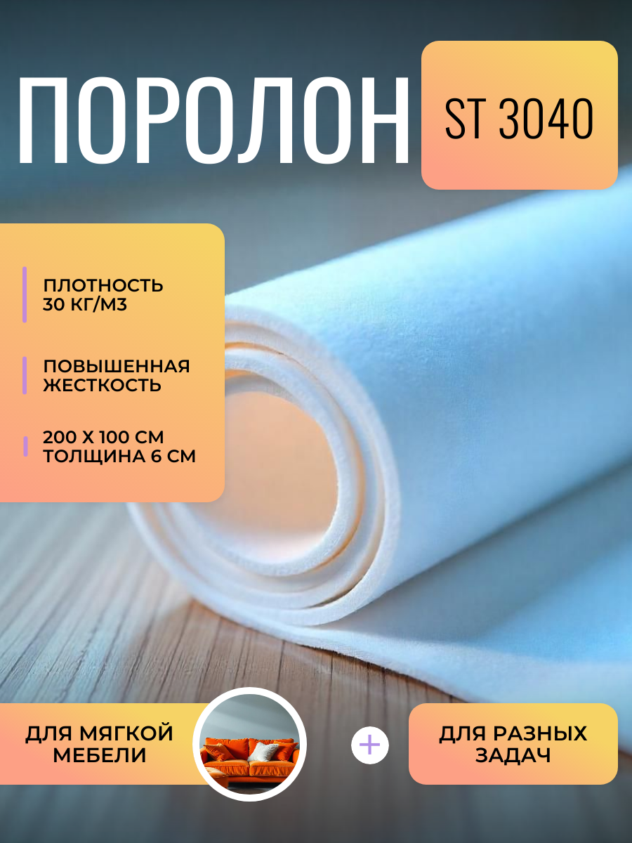 Купить Поролон мебельный Фомлайн ST3040, 200x100x6 см, 30кг/м³, повышенная плотность, лист с доставкой по всей России.