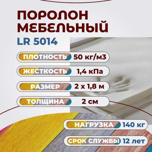 Поролон мебельный LR5014 обладает высокой плотностью и долговечностью, что гарантирует его износостойкость и долгий срок службы. В упаковке вы найдете один лист поролона размером 2000*1800*20 мм.
