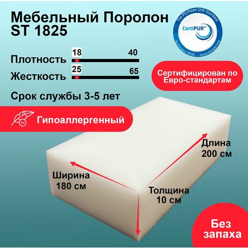 Стандартный пенополиуретан ST1825 - самый экономичный листовой эластичный поролон с широком спектром использования: от мягкой мебели до утепления и рукоделия. - В мебели подойдет для верхних "смягчащих слоев" или для элементов, которые не несут высокую нагрузку - Для экономичных матрасов со средним сроком службы - Для рукоделия и различных бытовых задач - Для производства сумок и чехлов - Для теплоизоляции и звукоизоляции Поролон полностью гипоаллергенен: - хорошо пропускает воздух, - не собирает пыль, - влагостойкий, - не поддерживает образование плесени, грибка и бактерий и может использоваться даже для самых маленьких детей Продукция имеет сертификаты по отечественным и международным стандартам. Также это подтверждено в процессе эксплуатации нашими постоянными покупателями, в числе которых крупные производственные предприятия, школы и детские сады, рестораны и театры. В зависимости от поставке к поставке, цвет одной и той же марки поролона может быть разным - это не влияет на свойства наполнителя. Если вам важно получить определенный цвет, вы можете воспользоваться функцией "написать продавцу" и мы проконсультируем вас по наличию цветов поролона на текущий момент. Важно! Листы могут желтеть под воздействием солнечных лучей, но это тоже не меняет технические характеристики пенополиуретана. При транспортировке мы упаковываем ппу в 3 слоя прочного полиэтилена и пропилена и сдуваем под вакуумом, поэтому после вскрытия упаковки, для полного восстановления размеров нужно разложить лист на ровной и твердой поверхности и подождать от 1 до 24 часов. Если лист был очень тонкий и пролежал в упаковке долго или вам нужно восстановить размер срочно, можно воспользоваться небольшим лайфхаком: побрызгать его водой и посушить феном или пройтись паровым утюгом.