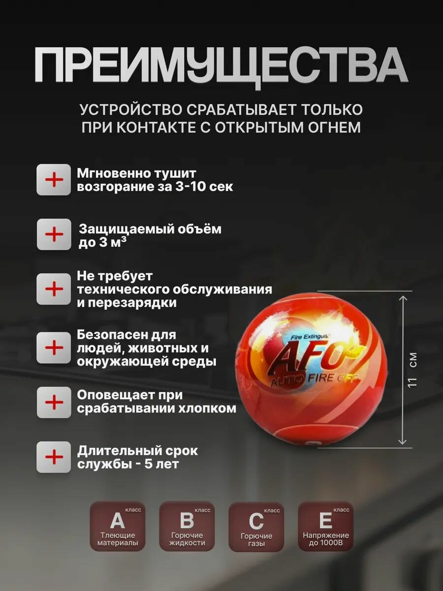 Вам больше не нужно находиться рядом с местом пожара, чтобы потушить огонь, шар изготовлен из абсолютно безвредного для окружающей среды материала и безопасен для пользователей. Если его бросить или закатить в огонь, огненный шар взорвется и издаст сильный шум, привлекая внимание всех, кто находится поблизости. Если в течение 3 секунд к нему прикоснется пламя, достигающее 70 градусов Цельсия, шар автоматически эффективно и быстро погасит огонь. Легкий вес всего 1,3 кг, форма шара, им легко могут пользоваться даже пожилые и дети. Тип изделия: шар для огнетушителя Вес: 0,5 кг Диаметр: 11 см, максимальная защита 1.0CBM