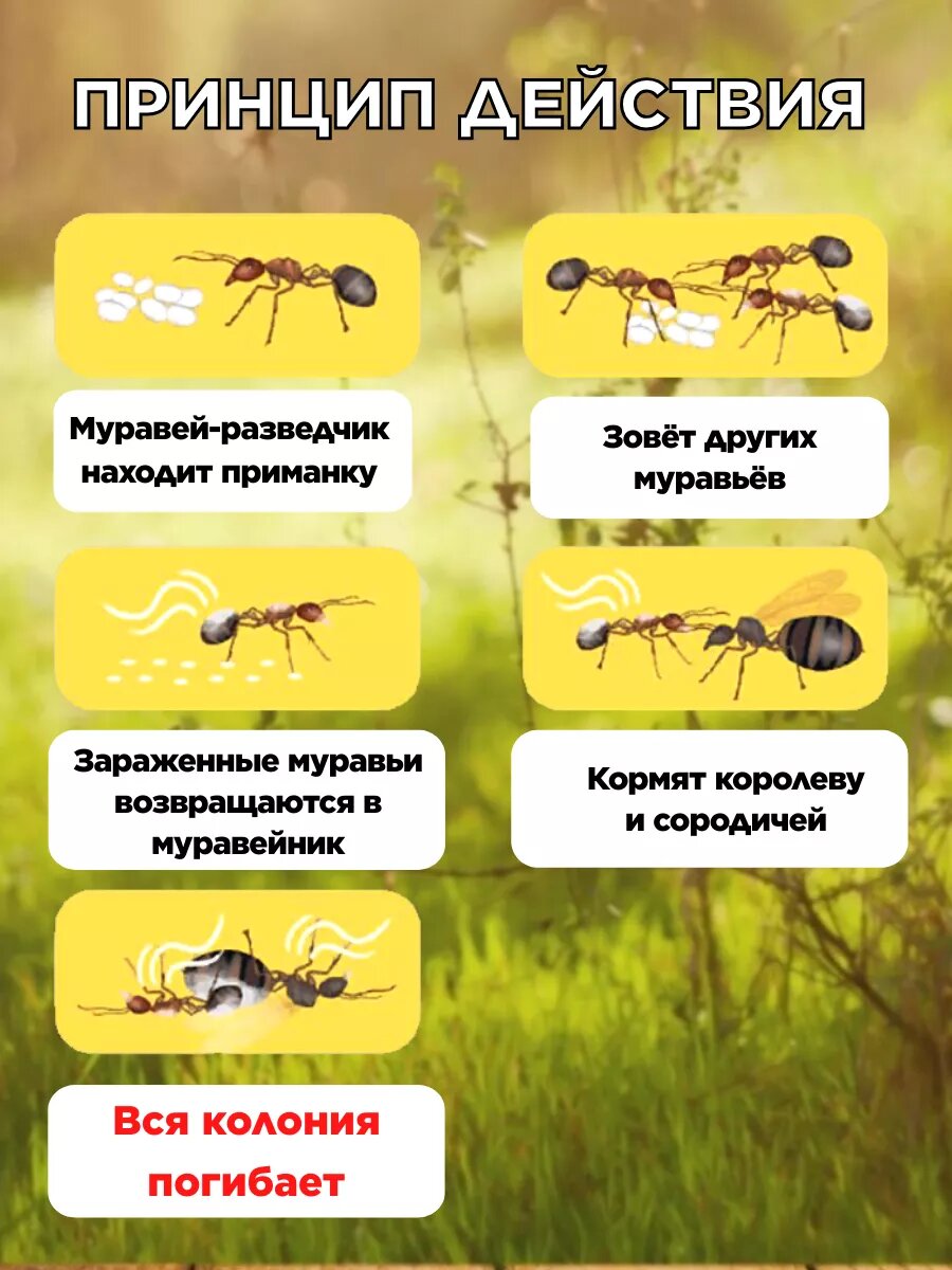 Принцип действия: порошок против муравьев представляет из себя гранулы, содержащие вещество и приманку, способную привлечь к себе садовых или домашних муравьев.