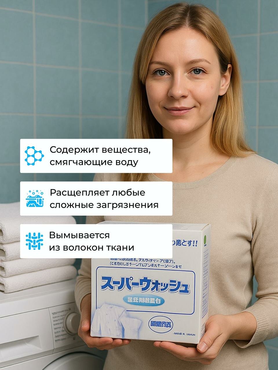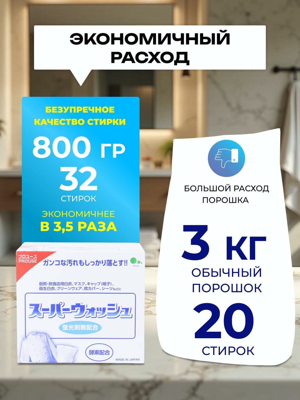 Стиральный порошок автомат для белого белья с ферментами – концентрат. Подходит для стирки одежды людей с чувствительной кожей. Благодаря ферментам порошок проникает в волокна ткани, удаляя даже самые стойкие загрязнения. Сохраняет цвет и форму тканей. Порошок для стирки Super Wash не только очищает, но и помогает сохранить белизну ваших текстильных изделий, предотвращая их потемнение и износ. Этот порошок для белого идеально подходит для ежедневной стирки, делая вашу одежду свежей и приятной на ощупь. Используя данный порошок, вы обеспечиваете своей одежде не только чистоту, но и заботу, так как он разработан с учетом современных требований к стирке. Порошок стиральный подходит как для белого, так и для светлого белья, позволяя вам эффективно заботиться о разнообразных текстильных изделиях. Подходит для ручной стирки. Концентрированная формула - экономичный расход. Порошка хватит до 32 стирок.- Усиленный комплекс ферментов пигментные загрязнения - чай, кофе, вино, ягоды;- Комплекс ферментов очищает от жировых, белковых и полисахаридных загрязнений; Порошок для стирки Mitsuei быстро растворяется и хорошо вымывается из волокон при полоскании, предотвращает посерение ткани. Эффективен при стирке в низких температурах 30 С.