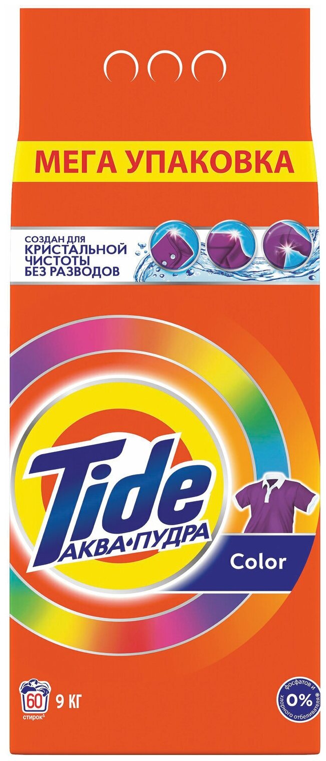 Порошок стиральный автомат Tide Color 9 кг Назначение: порошок для стирки Tide Аквапудра Color для цветных тканей позволяет поддерживать одежду всей семьи в идеальной чистоте и отличном состоянии. Стиральный порошок Tide Аквапудра Color прекрасно справляется даже с самыми трудно выводимыми пятнами на одежде, сохраняя яркие цвета стирка за стиркой. Благодаря технологии Аквапудра, порошок растворяется, только коснувшись воды, и моментально активируется, глубоко проникая в структуру ткани, чтобы обеспечить кристальную чистоту вашей одежды без разводов и остатков порошка даже на темных вещах и на швах. Если у вас чувствительная кожа, рекомендуем обратить внимание на стиральный порошок Тайд для чувствительной кожи. Преимущества Tide Аквапудра: - Удаляет трудновыводимые пятна даже на манжетах, воротничках и в области подмышек. - Дарит безупречную чистоту, сохраняя яркость цвета стирка за стиркой. - Кристальная чистота с первой стирки даже при 20°С. - Безопасный состав: 0% фосфатов и хлорсодержащего отбеливателя. -