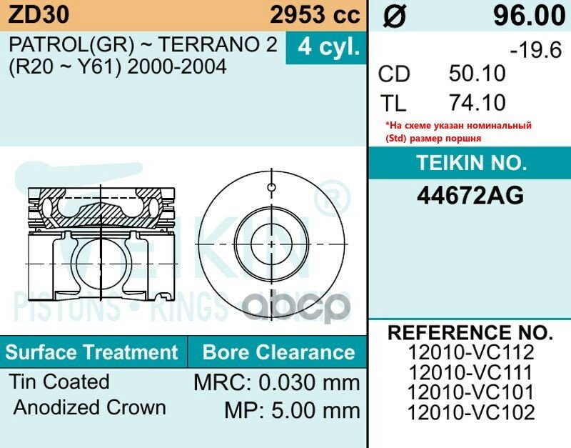 Поршень без колец Nissan ZD30 d96.0 STD (12010-VK600/12010-VX201) Teikin TEIKIN арт. 44672AGSTD