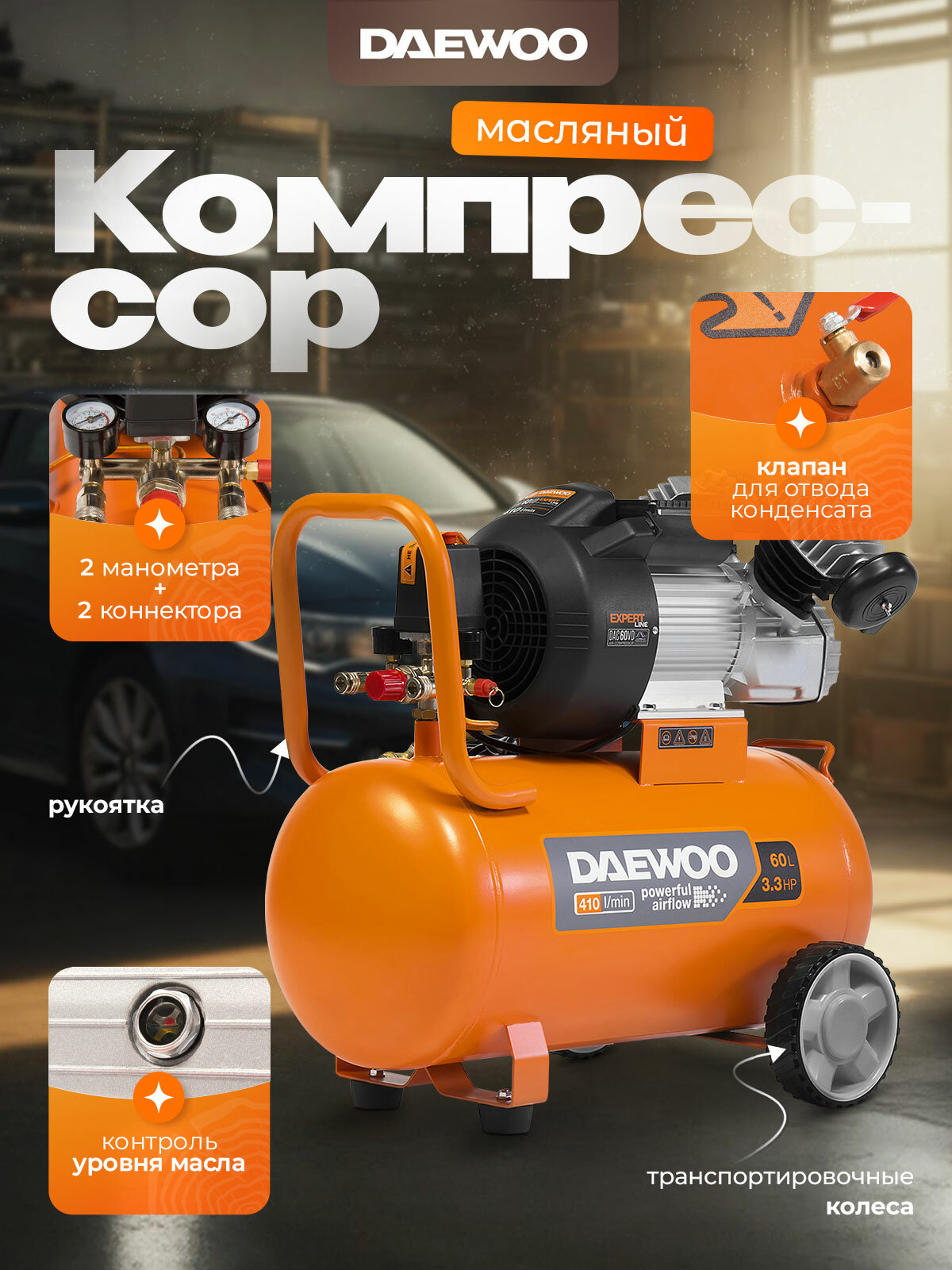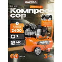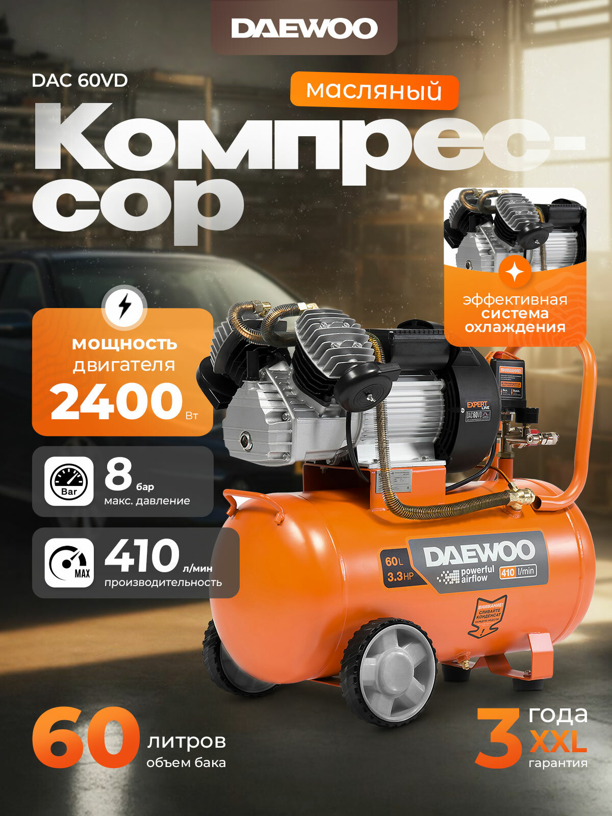| Дополнительная информация | Компрессор Daewoo DAC 60VD очень мобилен счет транспортировочных колес. Модель обладает производительностью 410 литров воздуха в минуту, оснащена небольшим двигателем (2850 об/мин). Степень защиты двигателя - IP 44. В компрессоре установлены две антивибрационные подушки, которые поглощают вибрацию при любой частоте работы двигателя. Модель оснащена индикатором уровня масла и защитой от перегрузок, что увеличивает срок службы компрессора. Химическая обработка корпуса перед покраской увеличивает коррозионную стойкость. Также качество повышается за счет высокотеплопроводных ребер жесткости, которые эффективно отводят тепло и увеличивают срок непрерывной работы на 50%. |