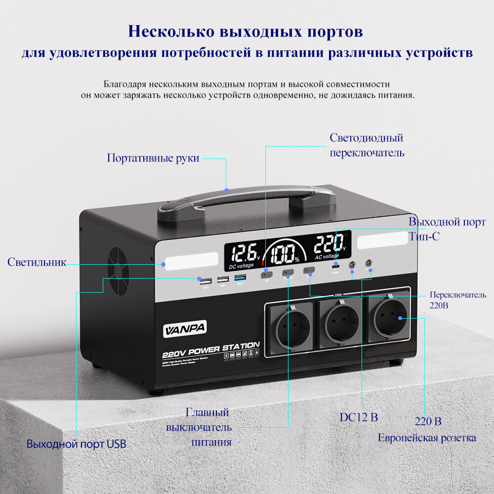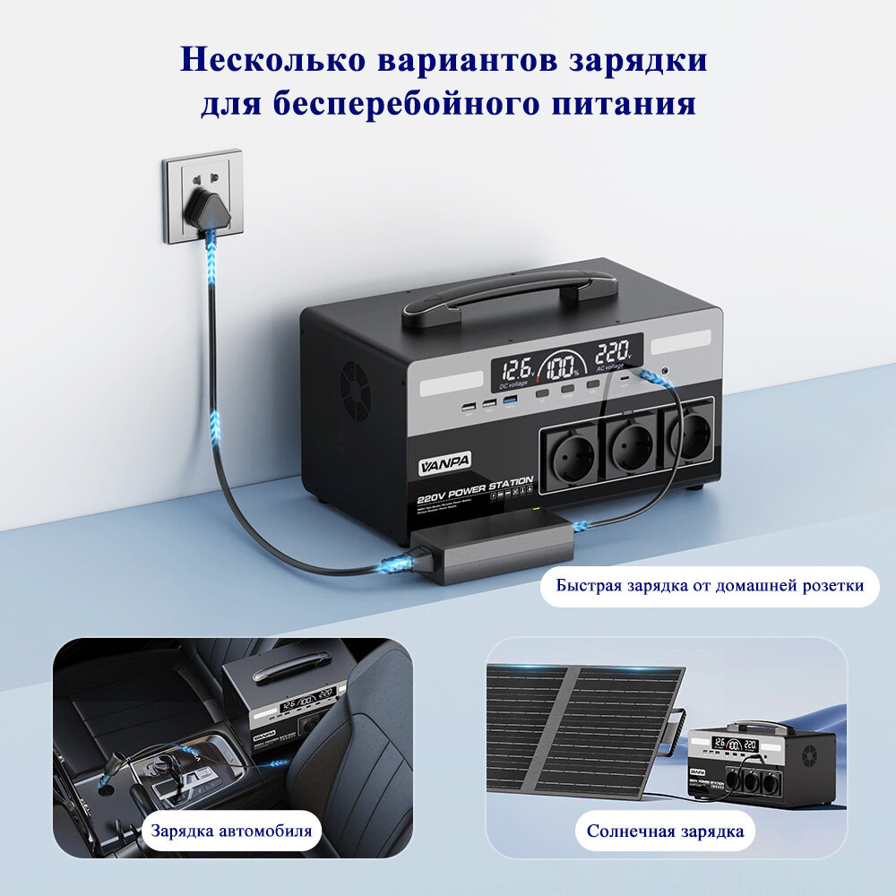Купить Портативная автономная электростанция VANPA 720Wh 1000Вт 300000мАч. Аккумуляторная батарея с доставкой по всей России.
