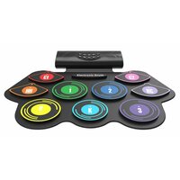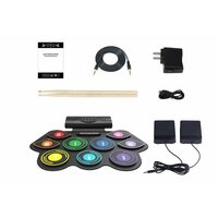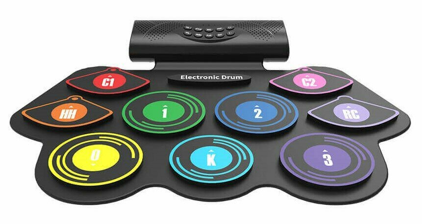 Roll Up Drum Kit MD862C – портативная электронная барабанная установка на силиконовом коврике. Она включает в себя 9 отзывчивых пэдов: хай-хэт, 2 крэша, райд, малый барабан, 3 тома и бас-бочку. В контроллер встроены 7 тонов (барабанных стилей), ритмы и демо-мелодии. В комплект входят 2 ножные педали и пара барабанных палочек. Встроенный аккумулятор позволяет играть без подключения к сети. Можно подключить колонки и наушники.