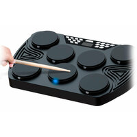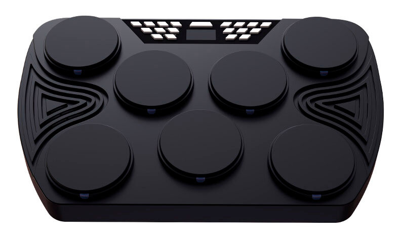 VELOCITY-SENSITIVE DRUM KIT ED01 - компактная портативная барабанная установка. В набор входят 7 пэдов, включая бас-бочку, хай-хэт, том-том, малый барабан и крэш, 2 ножные педали, 2 барабанные палочки. Доступны 16 тонов, 30 демо мелодий. Громкость звука зависит от силы удара. Есть функция записи, контроль скорости (30 - 250 уровней), громкость и темп регулируются. Помимо встроенного динамика устройство поддерживает подключение наушников, колонок. Устройство может быть подключено к компьютеру через Midi-выход или Micro-USB. Поддерживается Bluetooth соединение.