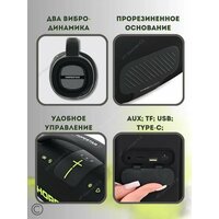 На задней панели акустики скрыты герметичной заглушкой разъемы: USB, microUSB, TF и AUX. Эта мощная акустическая система обладает пыле- и влагозащитой IPX6, что обеспечивает ей устойчивость к любым погодным условиям, будь то водяные потоки или сильные струи с любого направления, брызги, дождь или пыль. Противоскользящее основание обеспечивает устойчивость колонки на любой поверхности.
