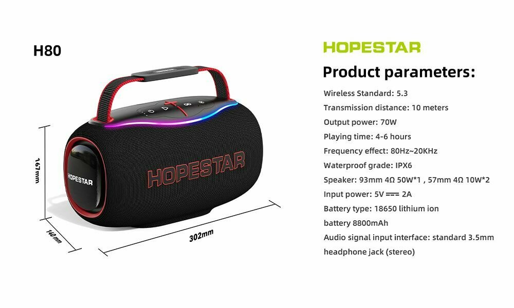 | Особенности | FM-радио, влагозащищенный корпус, встроенный микрофон (функция HandsFree), караоке, поддержка microSD, режим Power Bank, ремешок, ручка, световые эффекты |