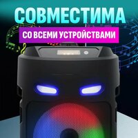 В комплекте с колонкой идет микрофон для караоке, который позволяет устраивать настоящие концерты прямо у себя дома.