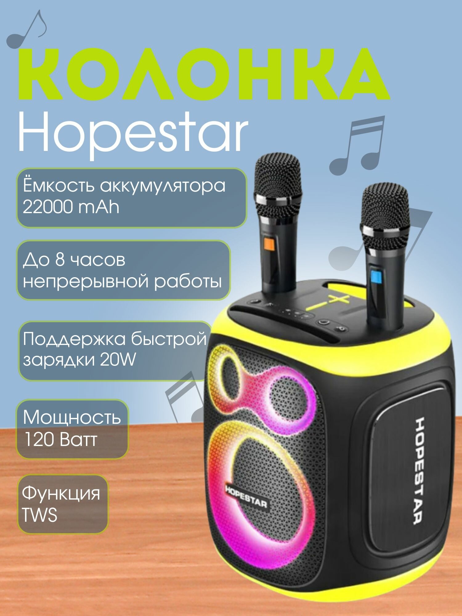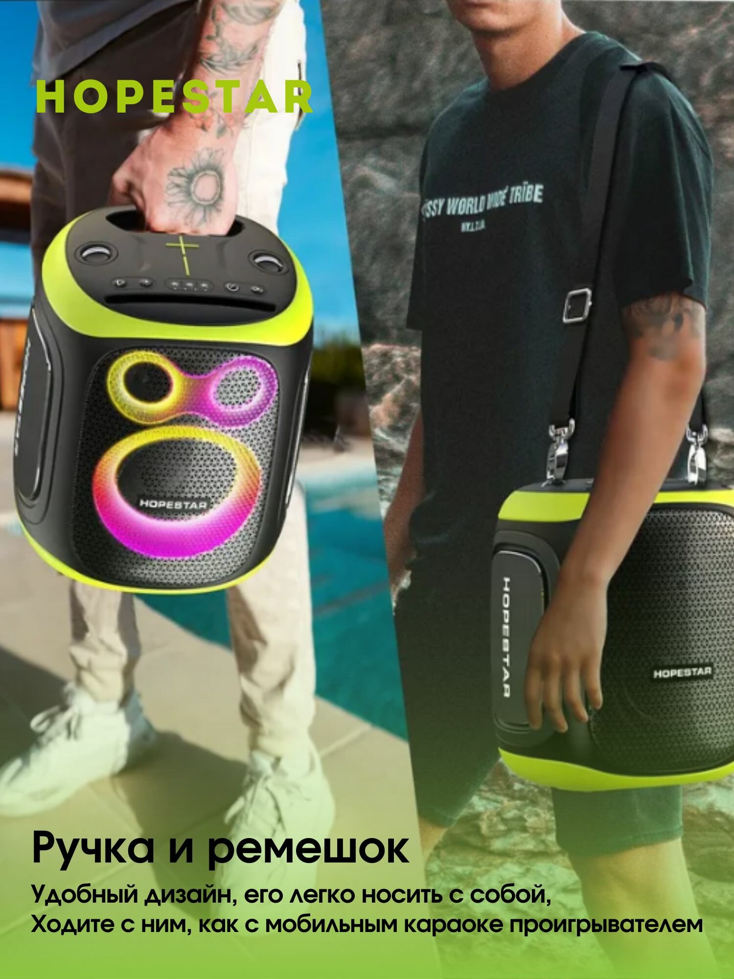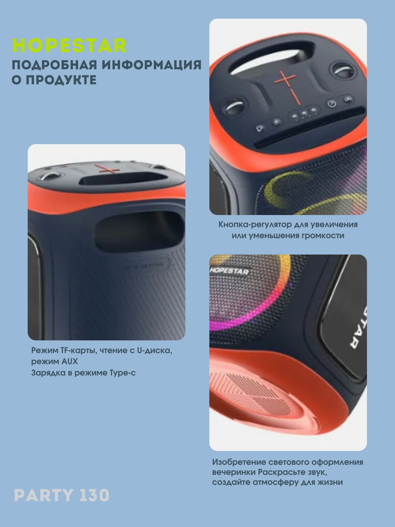 | Особенности | вибродинамик, влагозащищенный корпус, встроенный микрофон (функция HandsFree), караоке, поддержка microSD, режим Power Bank, ремешок, ручка, световые эффекты |