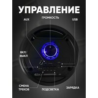 В комплекте с колонкой идет пульт дистанционного управления и USB-кабель для зарядки. Эквалайзер, регулировка громкости микрофона и светомузыка делают использование колонки еще более удобным и разнообразным.