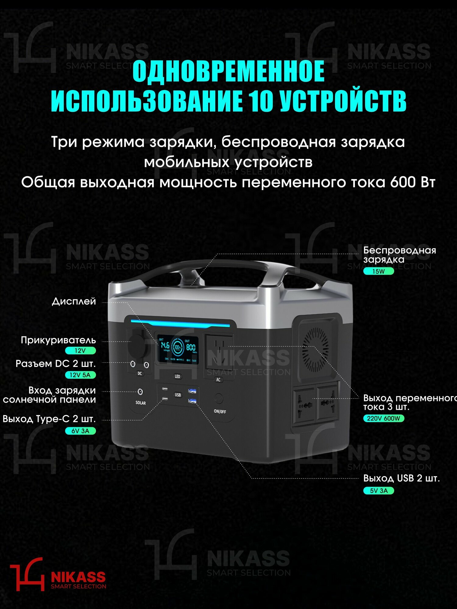 Представляем Вам мощную портативную электростанцию NIKASS, которая станет идеальным решением в путешествии, на отдыхе, даче и дома. Этот внешний аккумулятор с розеткой обладает ёмкостью 168 000 мАч, 3,2 V и пиковой мощностью 600 Вт, так что Вы можете быть уверены в надёжной поддержке ваших электронных устройств. Повербанк с розеткой поддерживает быструю зарядку, сквозной заряд и гарантирует безопасность использования, благодаря встроенной системе защиты. Зарядная станция способна запитать до 10 устройств - телефоны, ноутбуки, планшеты, проекторы, эхолоты, рации, дроны. Устройство весит всего 8.52 кг, имеет небольшой размер и встроенную ручку для переноски, что позволяет с лёгкостью брать его с собой. ИБП станет незаменимым помощником для кемпинга, рыбалки, охоты, походов, когда доступ к электричеству ограничен. Не упускайте возможность обеспечить себе комфорт и уверенность в наличии электричества в любых условиях. Приобретайте портативный генератор NIKASS и наслаждайтесь свободой и независимостью даже в самых экстремальных условиях.