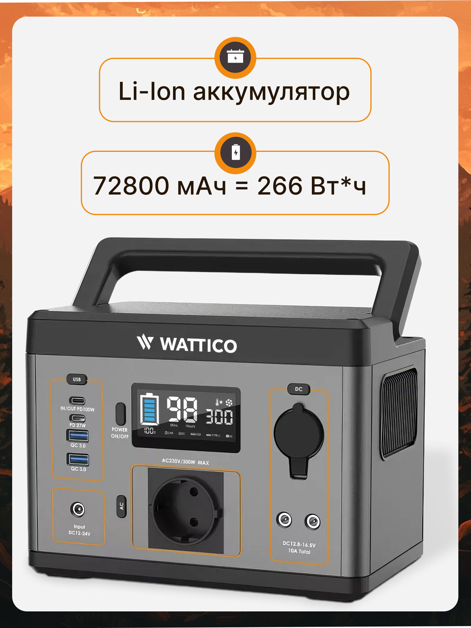 Представляем Вам мощную портативную электростанцию Wattico 300 Вт, которая станет идеальным решением для путешествий и кемпинга, дачи и дома, для охоты и рыбалки. Этот внешний аккумулятор с розеткой обладает ёмкостью 72 800 мАч и пиковой мощностью 600 Вт, так что Вы можете быть уверены в надёжной поддержке ваших электронных устройств. Зарядная станция поддерживает быструю зарядку, сквозной заряд и гарантирует безопасность использования, благодаря встроенной системе защиты.