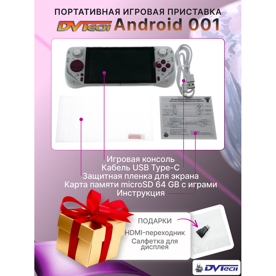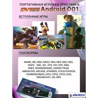 DVTech-Android 001 отличается эргономичным дизайном и удобным управлением. Консоль оснащена ёмким аккумулятором 3.7V 5000 mAh, который обеспечивает длительное время работы без подзарядки. Среди других преимуществ — яркий и насыщенный 5-дюймовый IPS-дисплей с разрешением 1280 x 720 пикселей, тачскрин, подсветка стиков, беспроводное сетевое подключение и поддержка Bluetooth-устройств (джойстиков, наушников и др.).