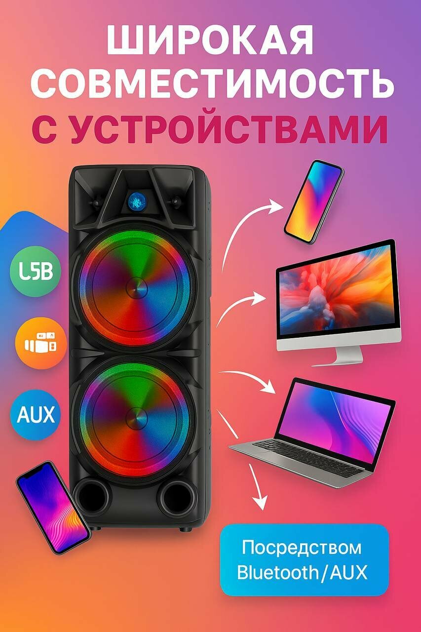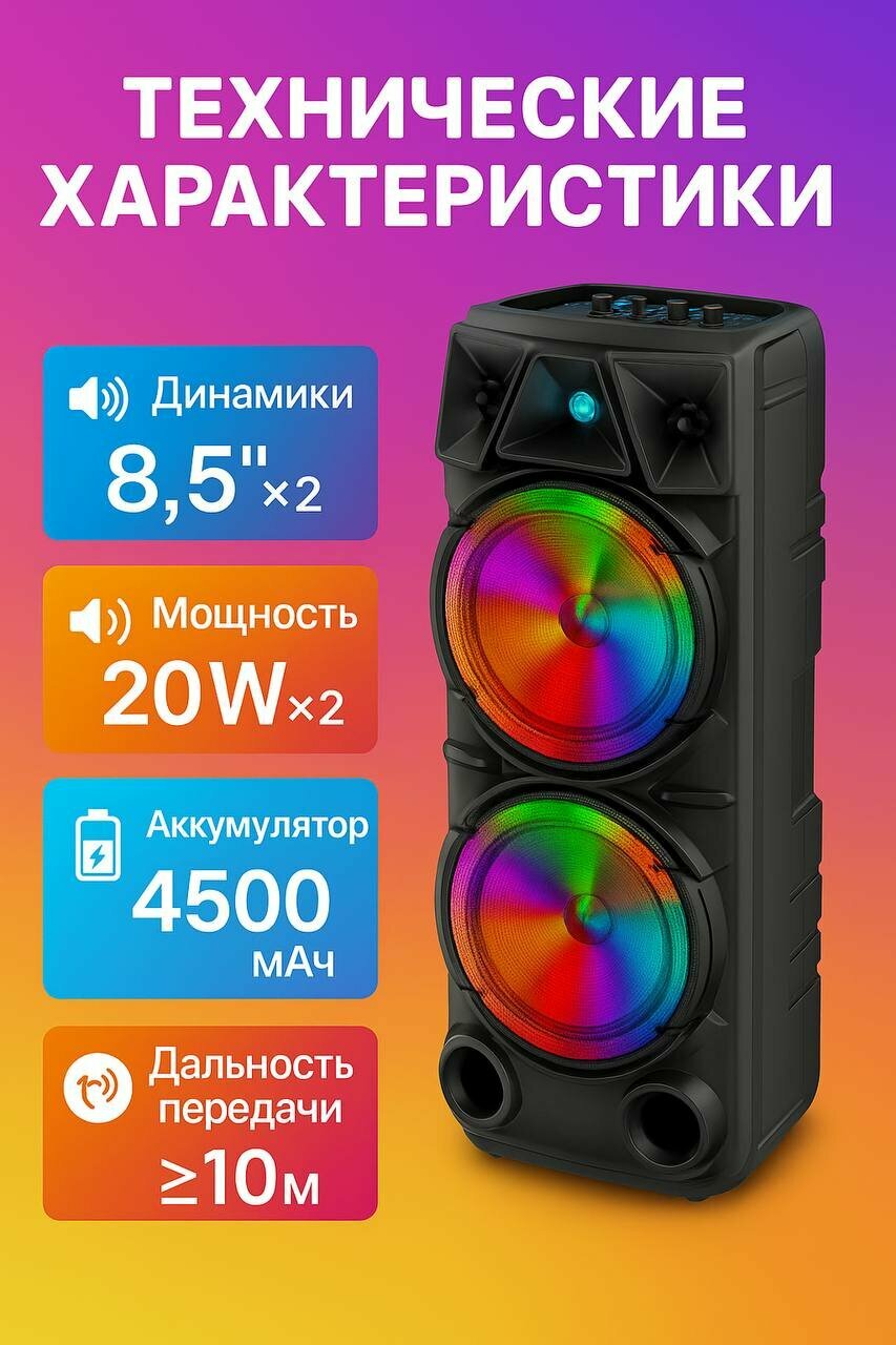 К колонке прилагается микрофон, что дает возможность не только наслаждаться музыкой, но и организовать караоке-вечеринки или проводить презентации. Благодаря беспроводной технологии вы сможете подключать свои устройства без лишних проводов, что обеспечивает удобство и комфорт в использовании. Свалка проводов больше не будет беспокоить вас, а отличное качество звука не оставит равнодушными ваших друзей и близких.