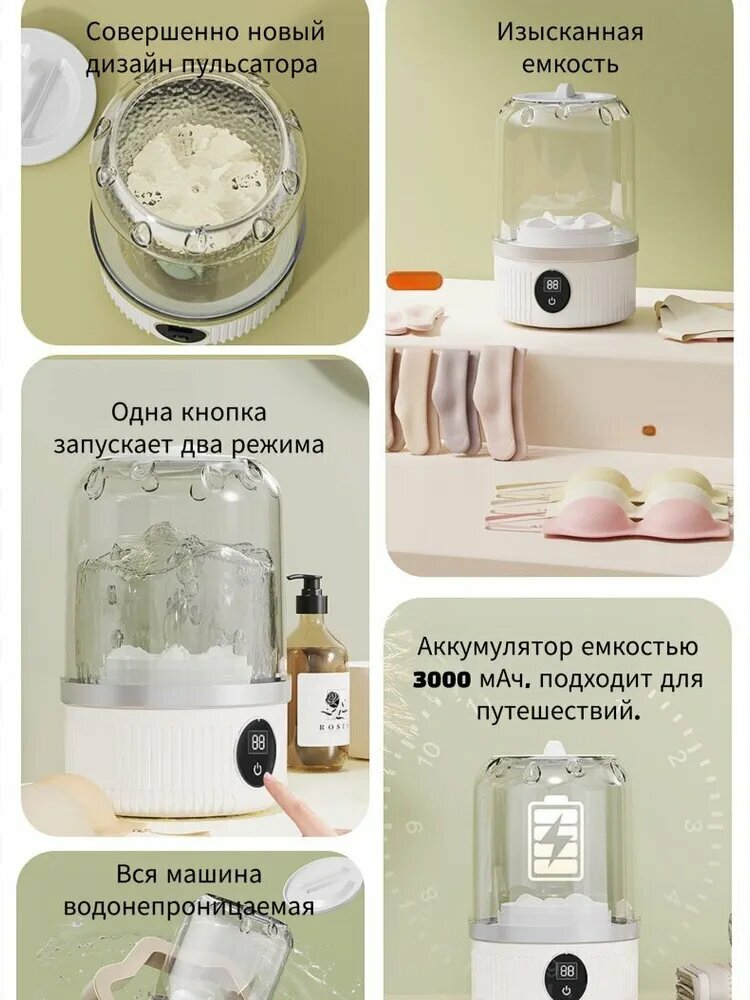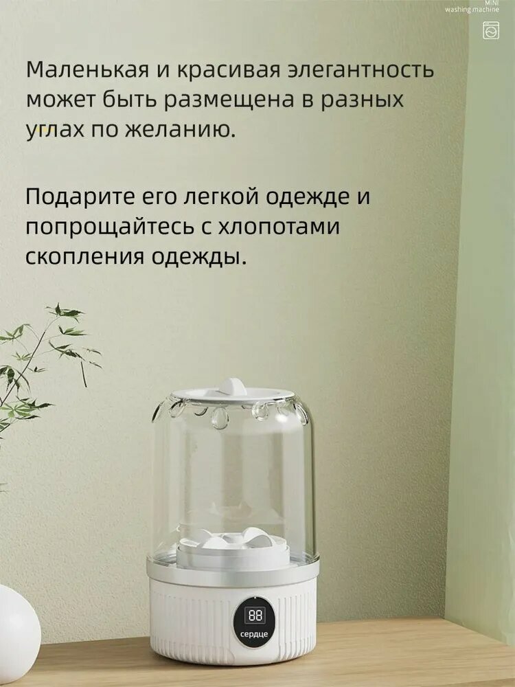 1. Основные характеристики Удобная конструкция для дополнительной стирки, нижнее белье и носки стираются отдельно, чтобы избежать перекрестного заражения; высокая скорость вращения при 1000 оборотах в минуту обеспечивает глубокое удаление стойких пятен; два режима (обычный режим на 5 минут, мощный режим на 10 минут) для удовлетворения ежедневных потребностей в быстрой уборке. 2. Красота дизайна Вся машина изготовлена из материала ABS + PP, с прозрачным чашеобразным корпусом, который четко отображает процесс стирки; круглая форма, небольшая и изысканная, подходит для размещения на раковине, балконе или столешнице стиральной машины, что не занимает много места и подчеркивает стиль домашней обстановки. 3. Пользовательский опыт Запуск одной кнопкой, простое управление, свободные руки; беспроводная зарядка, длительный срок службы батареи 3000 мАч, поддержка 20 мощных режимов очистки, легко переносится во время путешествий; вся машина водонепроницаема, безопасна в использовании и легко моется. 4. Технические преимущества Оснащенная полностью медным мотор-редуктором мощностью 390 вт, она стабильна и долговечна в эксплуатации; большая емкость объемом 1 л удовлетворяет ежедневным потребностям в стирке носков (около 5 пар), нижнего белья (около 5 штук) или нательного белья (около 4 штук); она предназначена для имитации колеса для ручной стирки обеспечивают бережную чистку и не повреждают одежду. 5. Применимые сценарии Подходит для различных условий, таких как проживание в семьях, общежитиях, офисах и т. д; Особенно подходит для молодежи, путешественников и групп пользователей, которые уделяют внимание гигиенической стирке; будь то ежедневная смена белья или чистка легкой одежды во время путешествий, с этим можно легко справиться. Комплектациястиральная машинка мини E