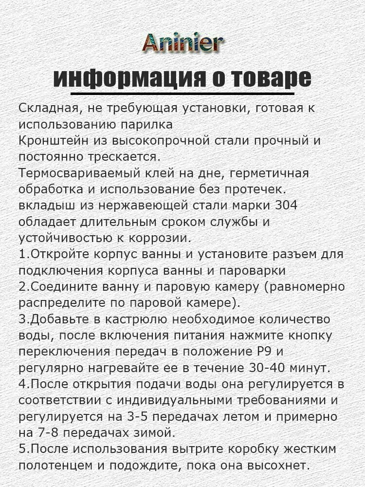 Портативная паровая сауна синий Портативная паровая сауна Складная, не требующая установки, готовая к использованию парилка. Боитесь запаха пота, оставшегося в коробке? После использования протрите влажной тряпкой. Утолщенная ткань сохраняет тепло и защищает от ветра. Кронштейн из высокопрочной стали прочный и постоянно трескается. Термосвариваемый клей на дне, герметичная обработка и использование без протечек. Вкладыш из нержавеющей стали марки 304 обладает длительным сроком службы и устойчивостью к коррозии. Первый шаг: Откройте коробку для ванны, установите разъем для подключения коробки для ванны и пароварки. Второй шаг: соедините ванну и паровую камеру (равномерно распределите по паровой камере). Шаг 3: Добавьте в кастрюлю необходимое количество воды, после включения питания нажмите кнопку переключения передач в положение P9 и регулярно нагревайте ее в течение 30-40 минут. Четвертый шаг: После открытия подачи воды, в соответствии с индивидуальными настройками, она регулируется на 3-5 передачах летом и примерно на 7-8 передачах зимой. Шаг 5: После использования протрите коробку жестким полотенцем и подождите, пока она высохнет, прежде чем забирать ее. Показать полностью