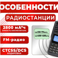 | Дополнительная информация | Функции сканирования частот Настройка с клавиатуры Одновременный прием двух каналов/частот Двухчастотный дисплей FM радио Порт USB Type-C для зарядки в аккумуляторе и в зарядном стакане Влагозащитный корпус DCS /CTCSS Аварийная сигнализация Аналоговый скремблер речи Фонарик частотный сканер, VOX |