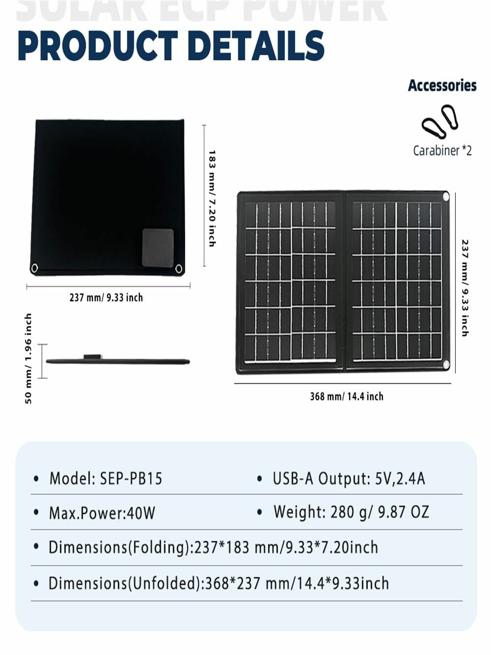Купить Портативная солнечная панель SEP-PB15, 40Вт, складная, водонепроницаемая, 2USB, тип А и тип С с доставкой по всей России.