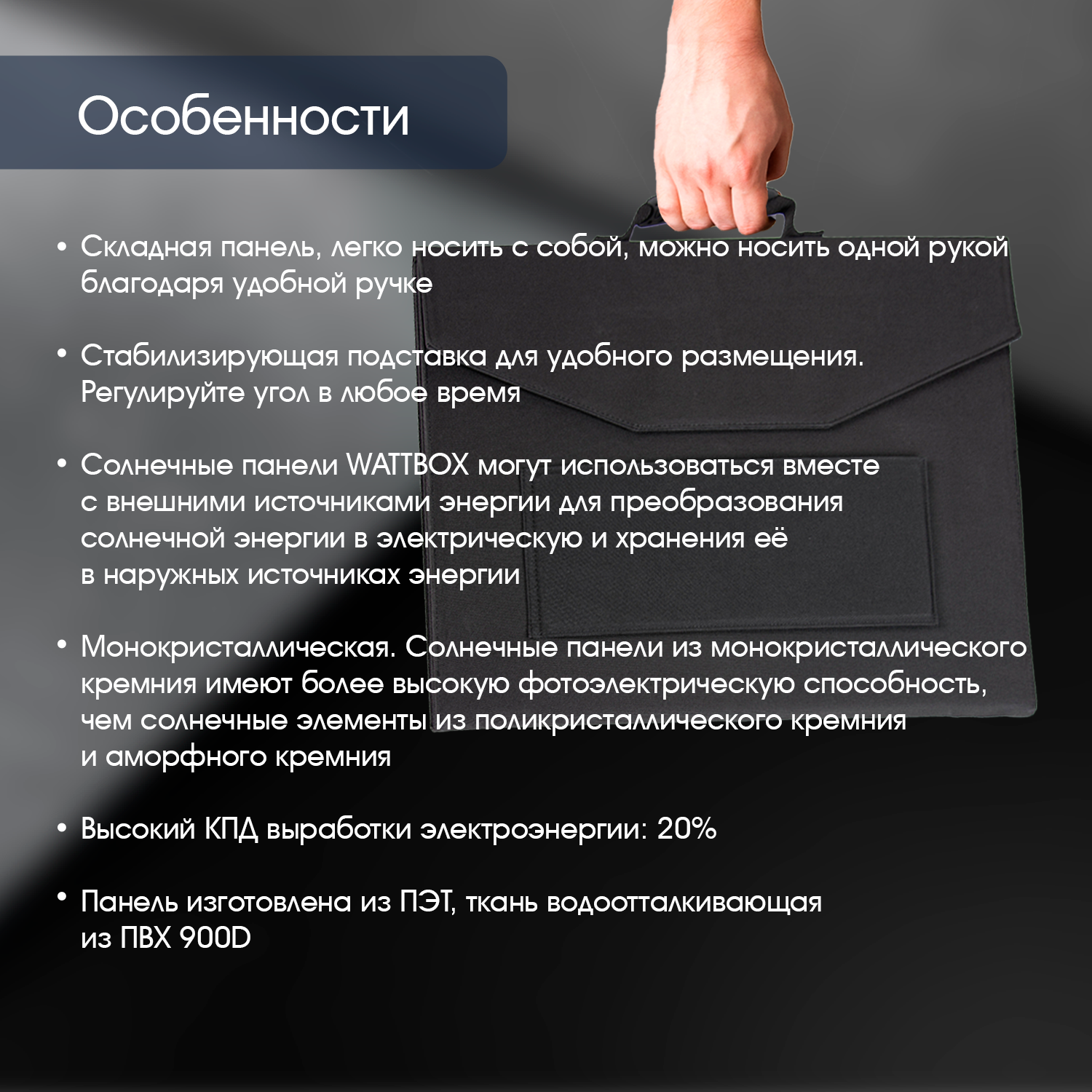 Преимущества: Складная панель, легко носить с собой, можно носить одной рукой благодаря удобной ручке; Стабилизирующая подставка для удобного размещения. Регулируйте угол в любое время; Солнечные панели WATTBOX могут использоваться вместе с внешними источниками энергии для преобразования солнечной энергии в электрическую и хранения её в наружных источниках энергии; Монокристаллическая. Солнечные панели из монокристаллического кремния имеют более высокую фотоэлектрическую способность, чем солнечные элементы из поликристаллического кремния и аморфного кремния; Высокий КПД выработки электроэнергии: 23%; Панель изготовлена из ПЭТ, ткань водоотталкивающая из ПВХ 900D; Совместимость с моделями WATTBOX: DW 501, DW 010, M9, K5, D5;