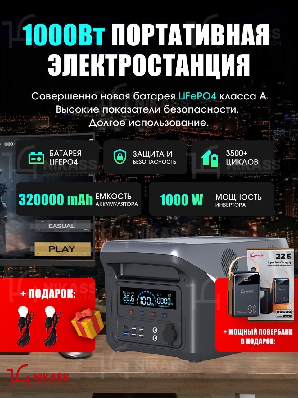 Портативная зарядная станция - идеальный источник энергии для путешествий и загородных вечеринок, мощный резервный накопитель энергии для поездок на природу или для дачи. Портативная электростанция в компактном и легком исполнении с несколькими разъемами для зарядки различных устройств средней мощности. Не беспокойтесь об отсутствии розеток и электричества поблизости. LВы сможете зарядить на свежем воздухе такие приборы, как блендер, походный чайник, проектор, ноутбук, автохолодильник и различные дачные инструменты. Портативную электростанцию также использовать в качестве резервного источника питания для небольших бытовых приборов и гаджетов в случае аварийного отключения электричества.
