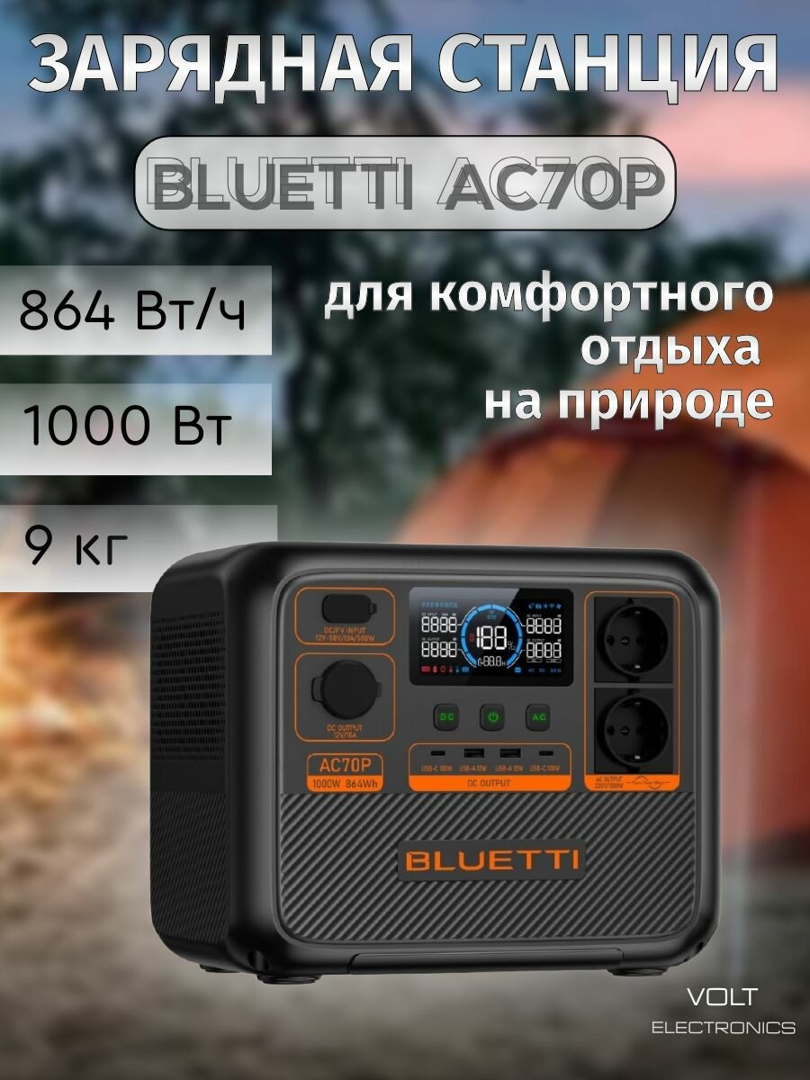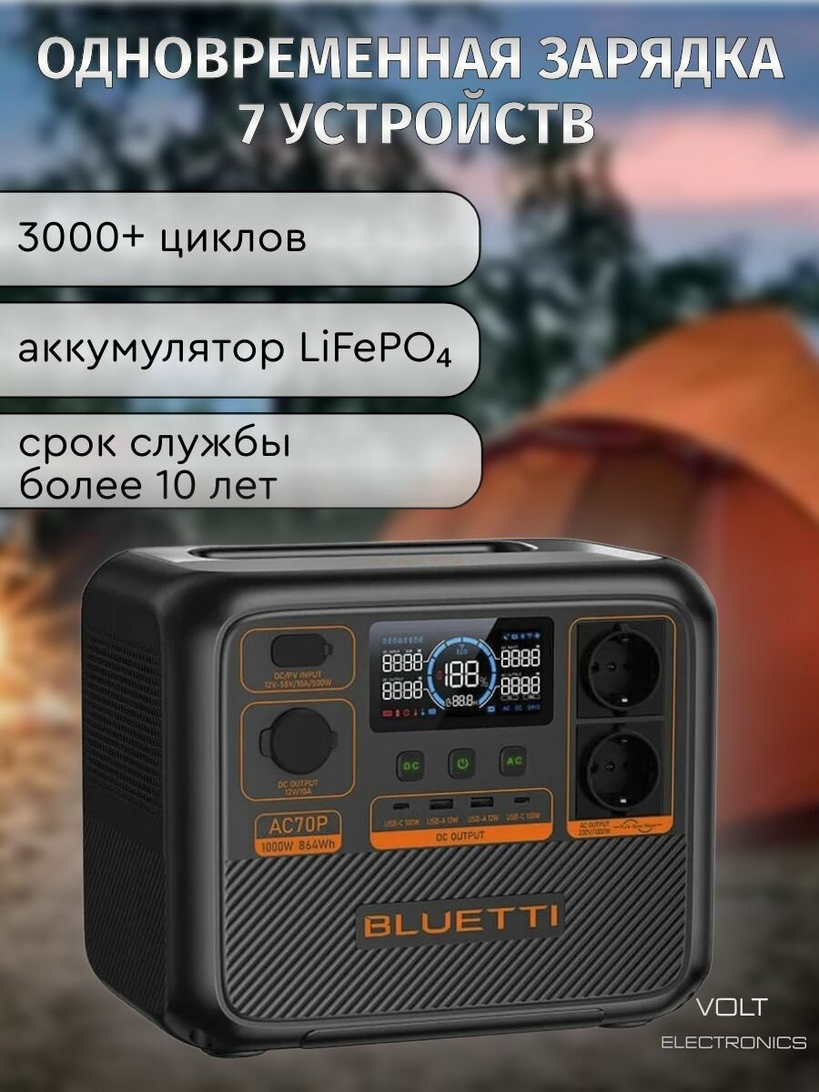 Портативная зарядная станция BLUETTI AC70P (емкость 864 Втч | технология Power Lifting | мощность до 2000 Вт | UPS)